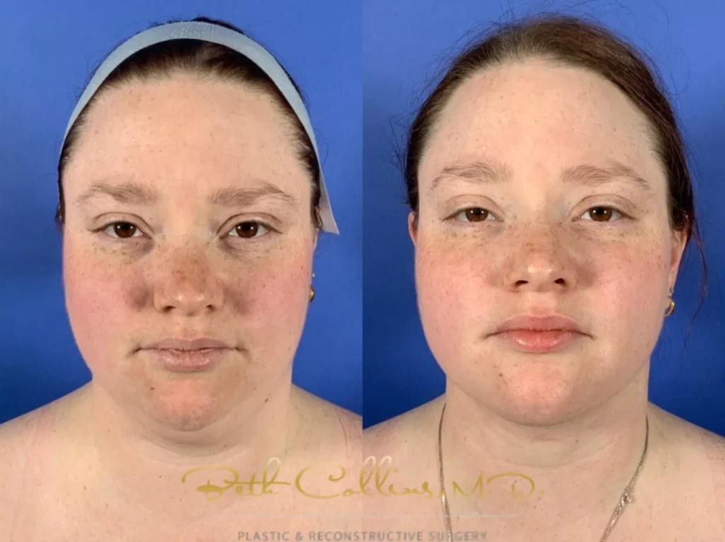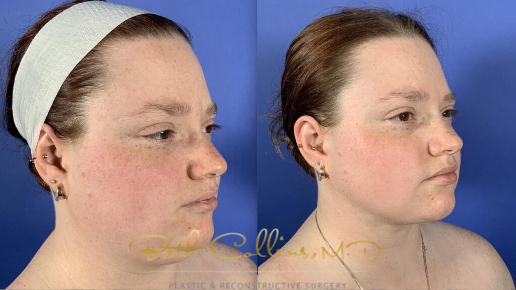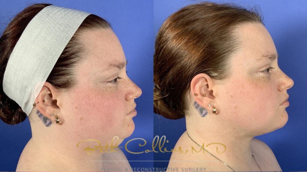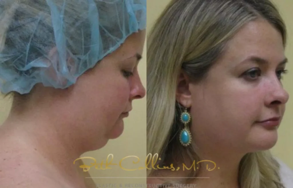 Something to note in the before-and-after photos is that the patients are younger, with skin that remains elastic, so it can “shrink to fit” the new contours once the fat is removed. You can see how liposuction creates a more defined jawline and erases the double chin.