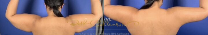 This female patient wanted to tighten the loose, hanging skin on her upper arms. Dr. Collins performed an arm lift to remove the excess skin, reshaping her upper arms to look more toned.