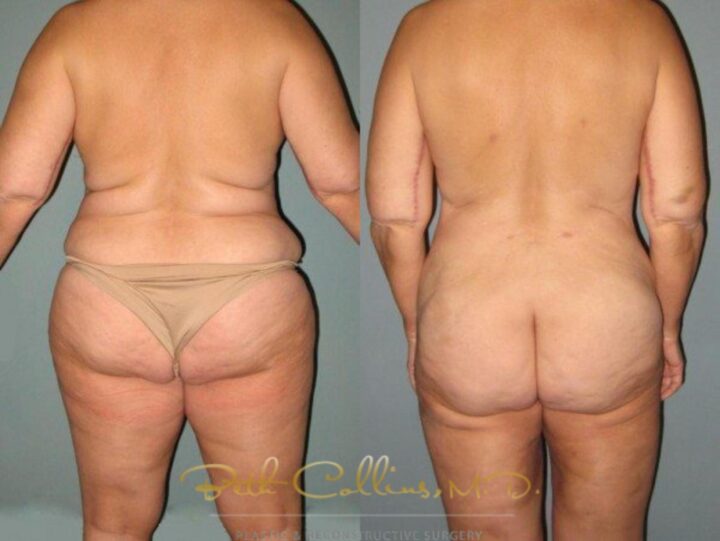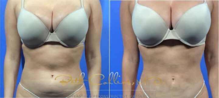 This female patient wanted to reshape her abdomen. She had excess fat on her stomach, waist, and back. Dr. Collins performed a tummy tuck along with 360 liposuction to give her a flat stomach and hourglass shape to help her look and feel her best.
