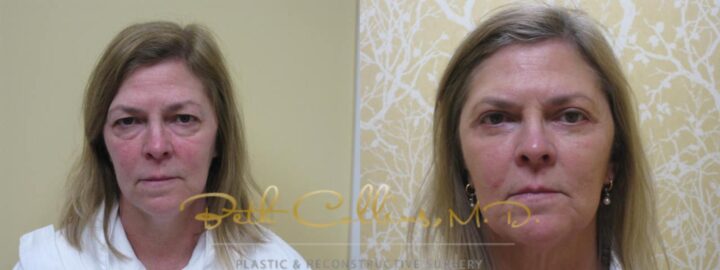 This patient complained of the loose skin in her neck and under her chin. She was unhappy with the jowls that were starting to form as well as the hallows in her upper eye. Dr. Collins performed a deep plane lamellar high SMAS facelift with fat grafting to her cheeks...