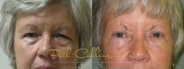 This patient had bilateral blepharoptosis. She had a bilateral levator re-insertion with an upper lid blepharoplasty to correct her drooping eyelids. She now has improved upper visual fields as well as improved cosmesis.