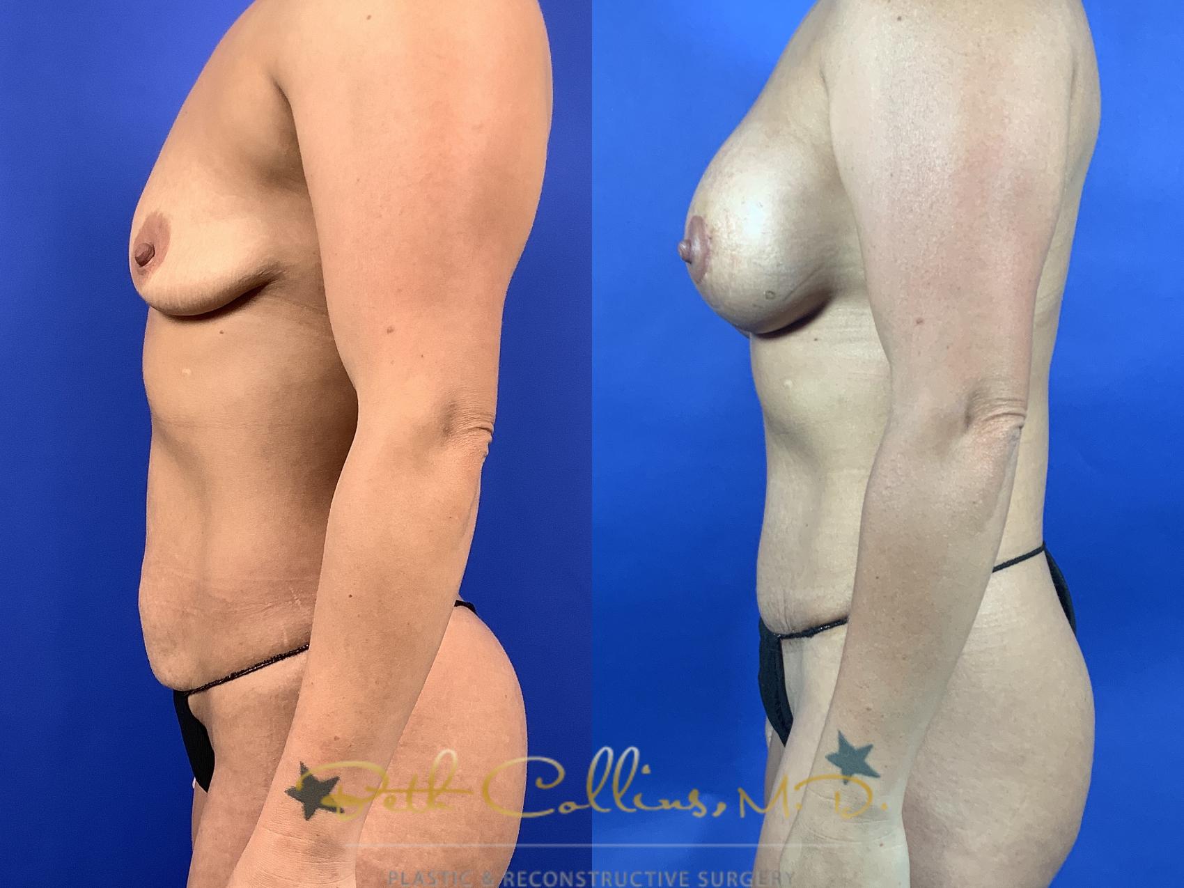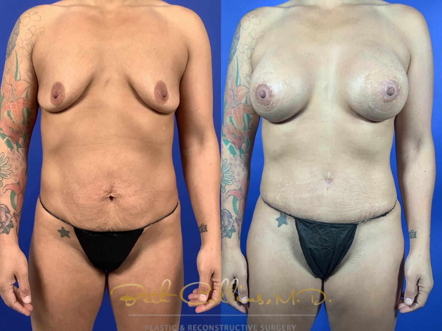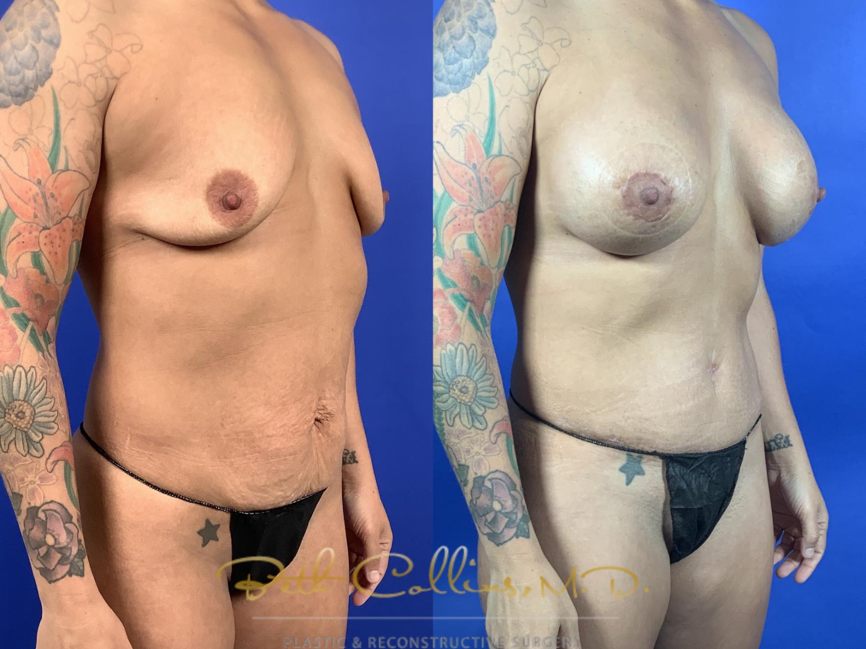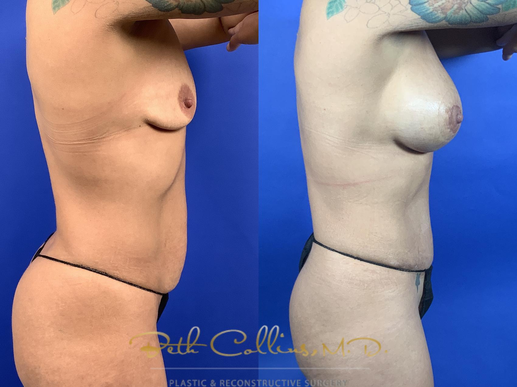 Mommy Makeover: What a difference a month can make….this mom had done EVERYTHING to get back in to shape after she had her kids. She exercises every day and eats right and yet she could never get rid of the wrinkly skin on her belly that hid her hard wood six pack. She also was not crazy about her sagging breasts. She came in last month for her mommy makeover, which in her case was breast augmentation with periareolar mastopexy and tummy tuck. This was all done at the same time so she only has one recovery. Here she is only one month after her surgery. She still has some healing to do, and it is just going to keep getting better. As the collagen remodels, her scars will virtually disappear, her breasts will soften and have a natural ptosis, but still keep that youthful upper pole fullness that implants are best able to achieve.