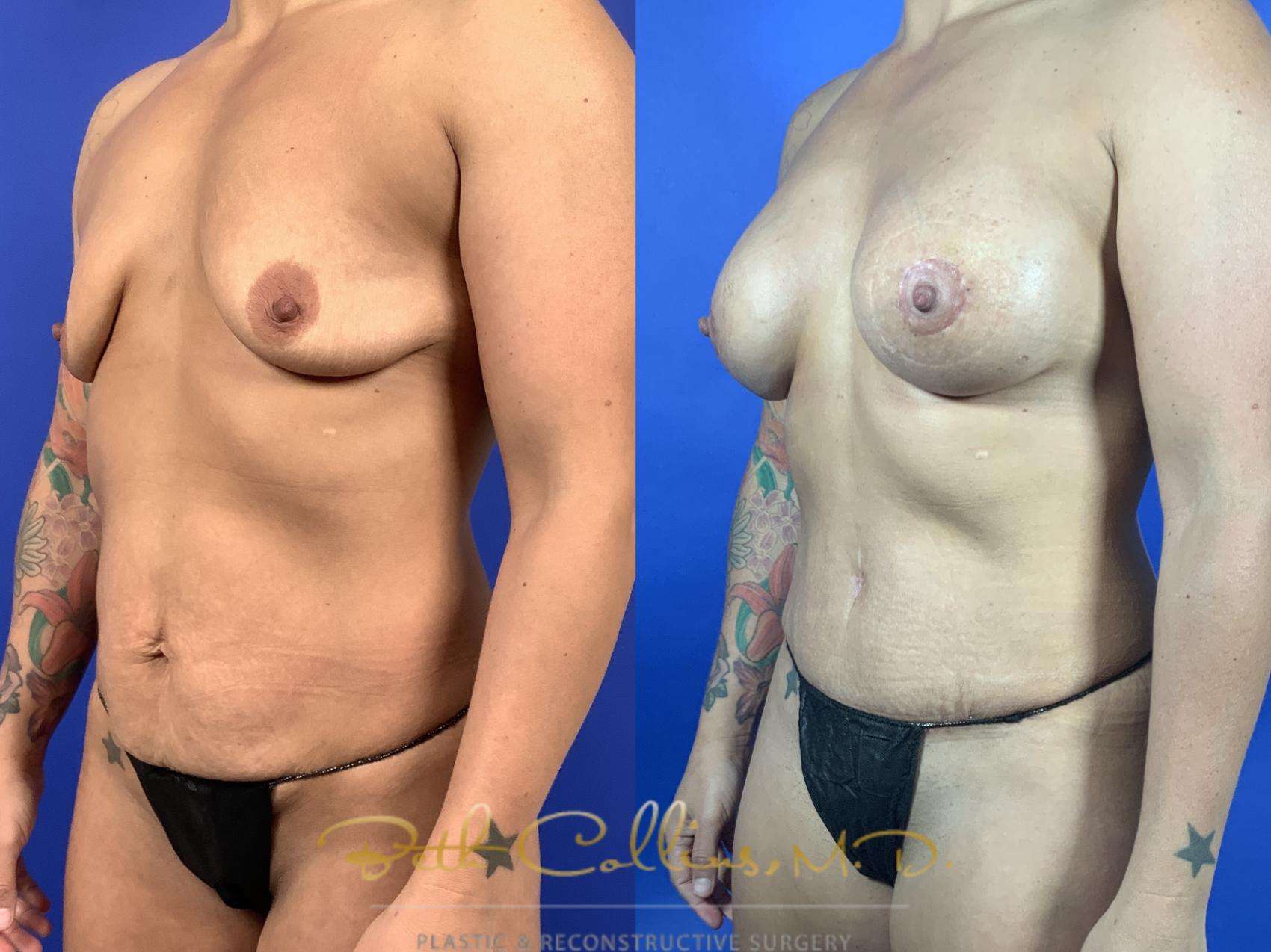 Mommy Makeover: What a difference a month can make….this mom had done EVERYTHING to get back in to shape after she had her kids. She exercises every day and eats right and yet she could never get rid of the wrinkly skin on her belly that hid her hard wood six pack. She also was not crazy about her sagging breasts. She came in last month for her mommy makeover, which in her case was breast augmentation with periareolar mastopexy and tummy tuck. This was all done at the same time so she only has one recovery. Here she is only one month after her surgery. She still has some healing to do, and it is just going to keep getting better. As the collagen remodels, her scars will virtually disappear, her breasts will soften and have a natural ptosis, but still keep that youthful upper pole fullness that implants are best able to achieve.