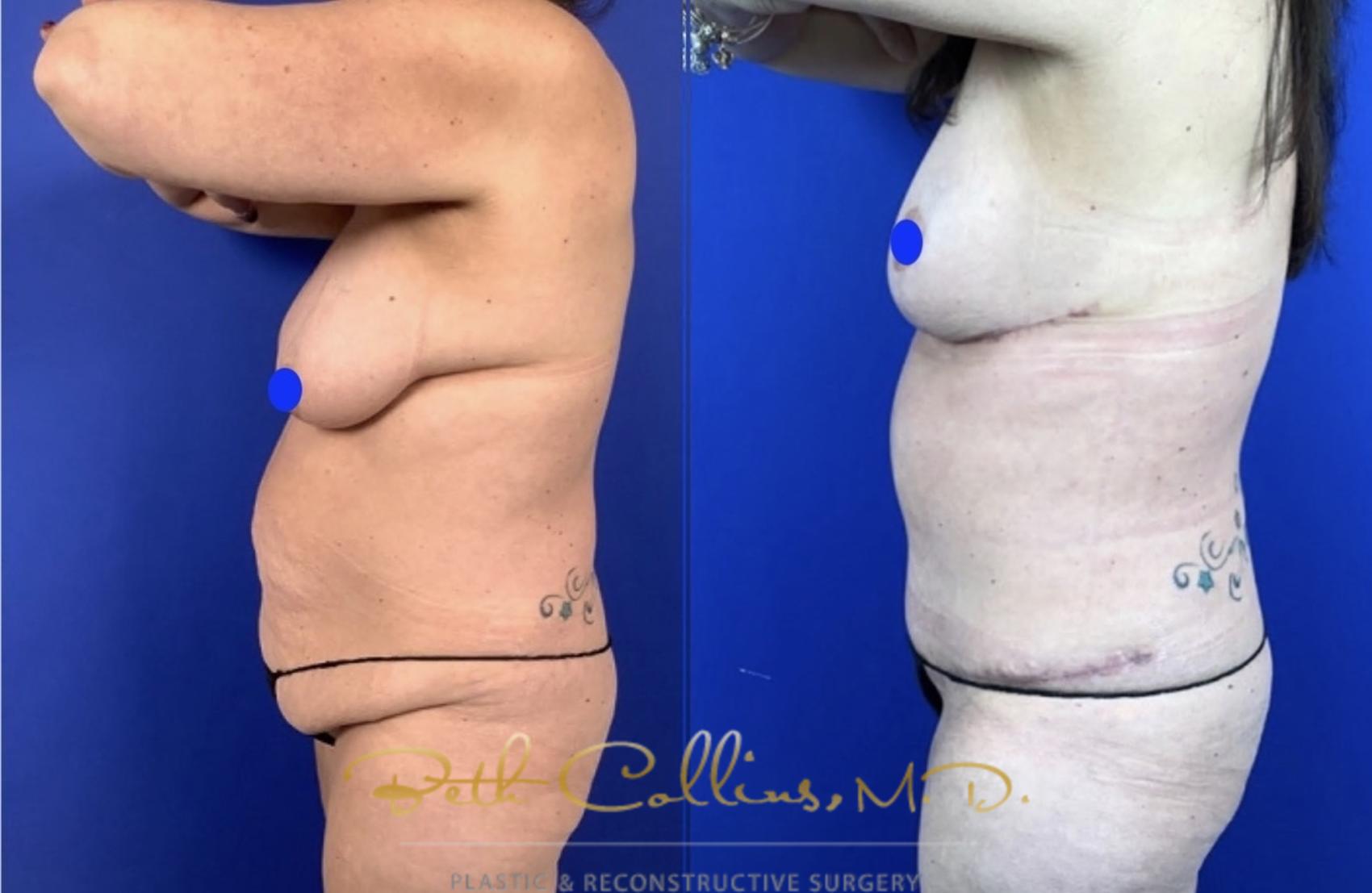 This patient was unhappy with the appearance of her breasts and abdomen after having children. After her consultation with Dr. Collins, they determined she would have a mommy makeover, with a breast lift and tummy tuck to reshape her breasts and abdomen, giving her back her pre-baby body.
