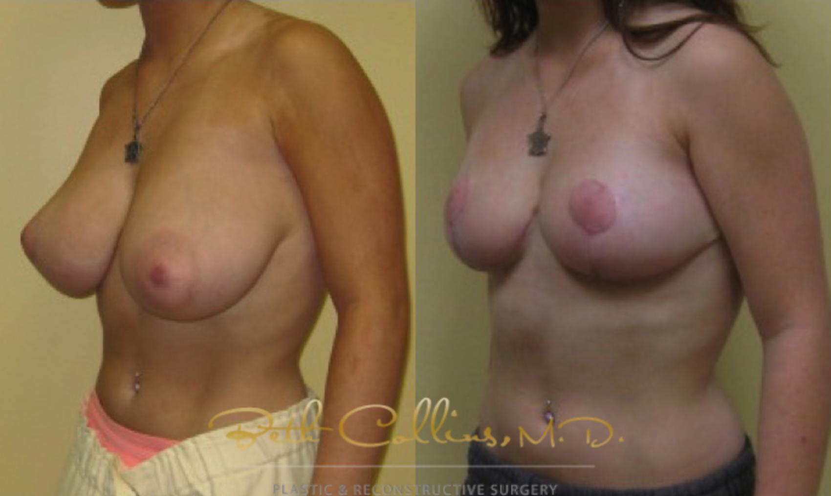 This young patient had multiple complains about her breasts. She had noticeable asymmetry and ptosis (sagging) of her breasts. She also did not like the size of her breasts. At her young age of 26, she felt that having these large and pendulous breasts made her look older and “matronly”. Using techniques of breast reduction, Dr. Collins was able to lift and reduce her breasts. Removing more tissue from her left breast evened out the size as well and gave her better symmetry and a more youthful appearing breast contour.