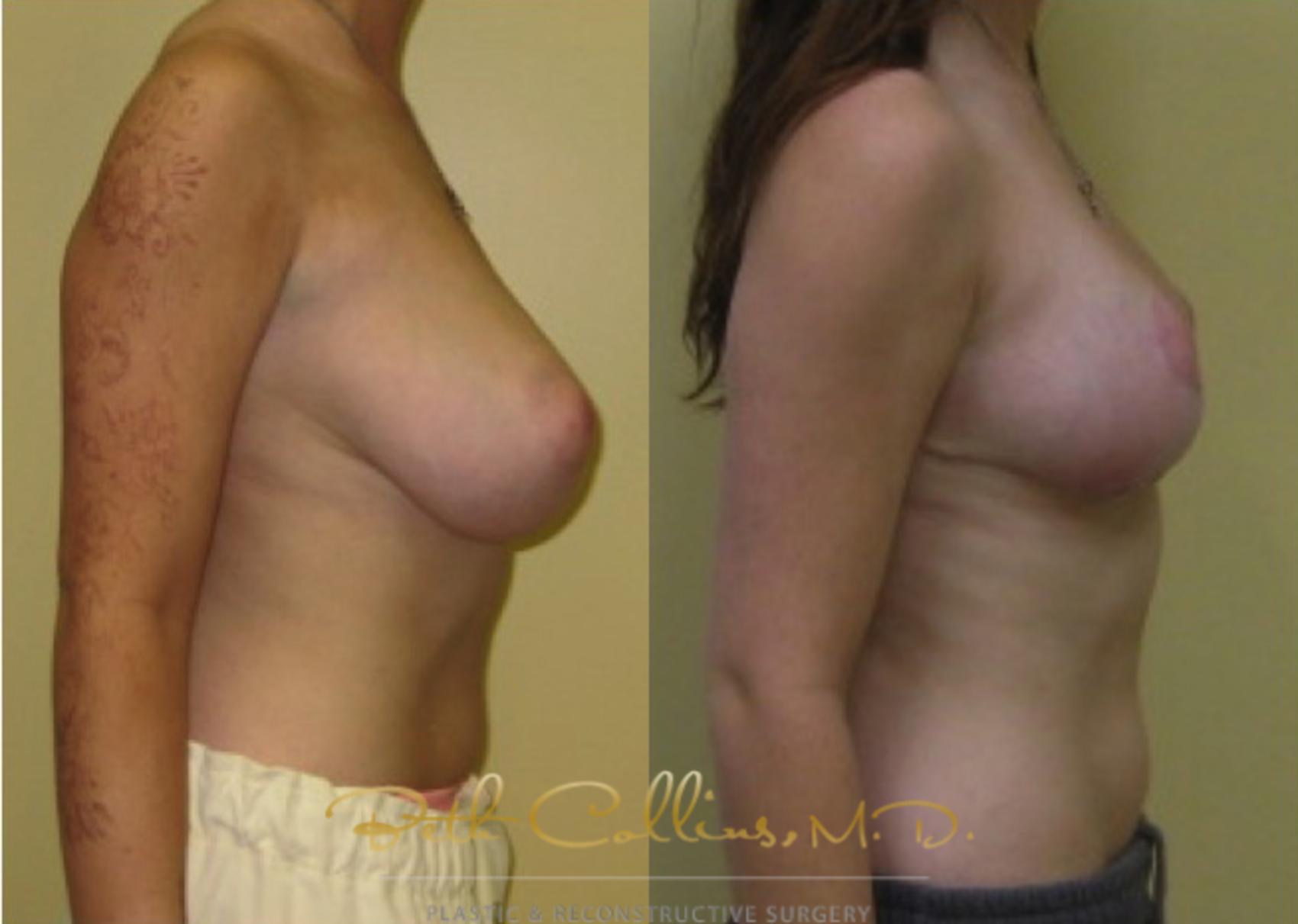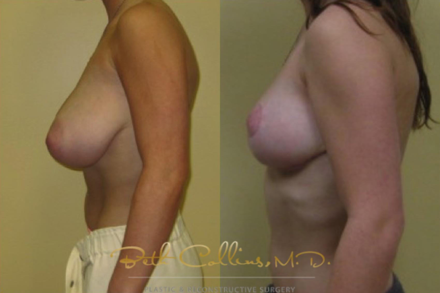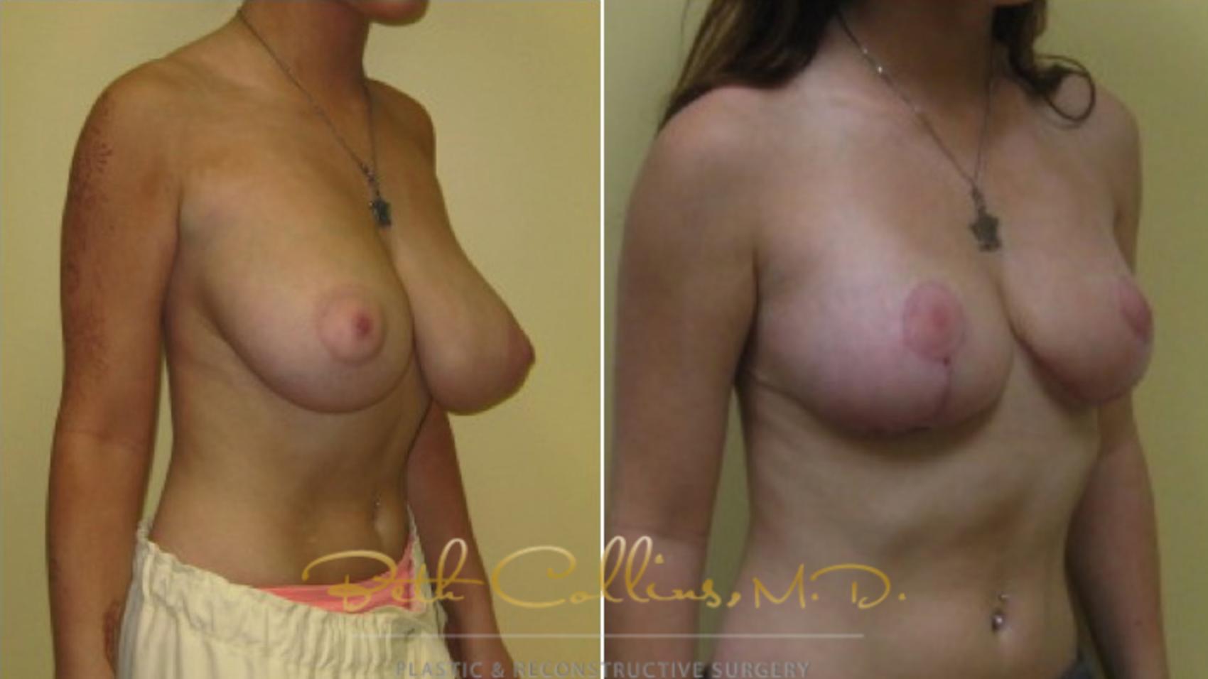 This young patient had multiple complains about her breasts. She had noticeable asymmetry and ptosis (sagging) of her breasts. She also did not like the size of her breasts. At her young age of 26, she felt that having these large and pendulous breasts made her look older and “matronly”. Using techniques of breast reduction, Dr. Collins was able to lift and reduce her breasts. Removing more tissue from her left breast evened out the size as well and gave her better symmetry and a more youthful appearing breast contour.