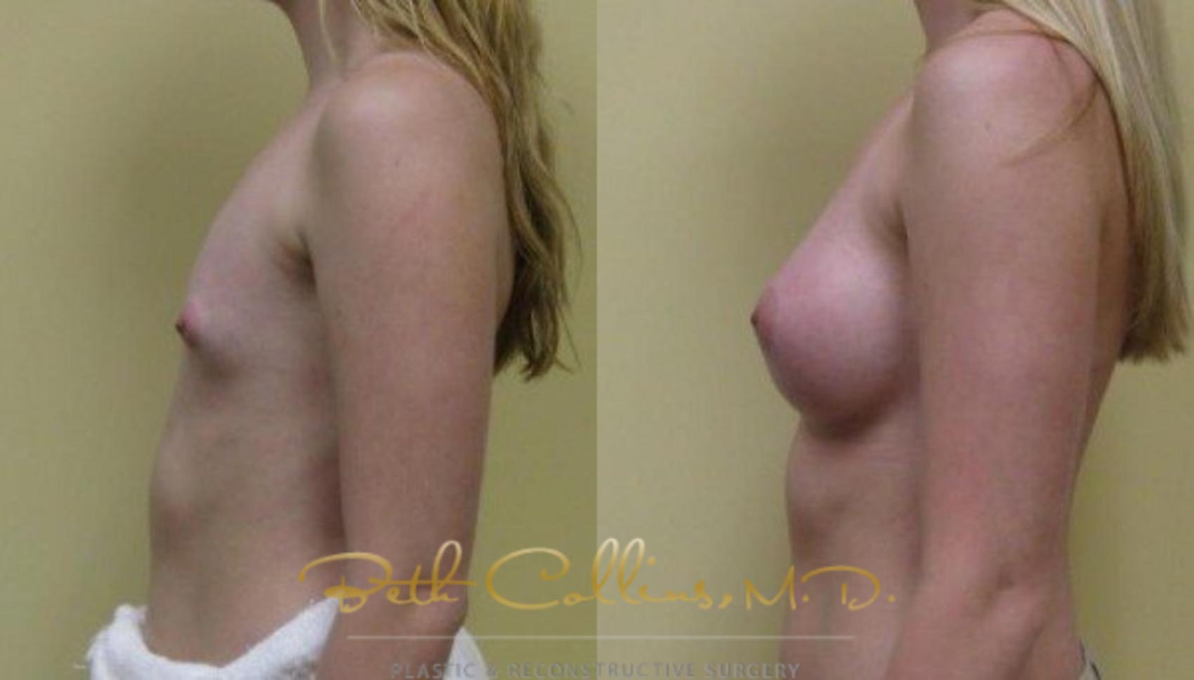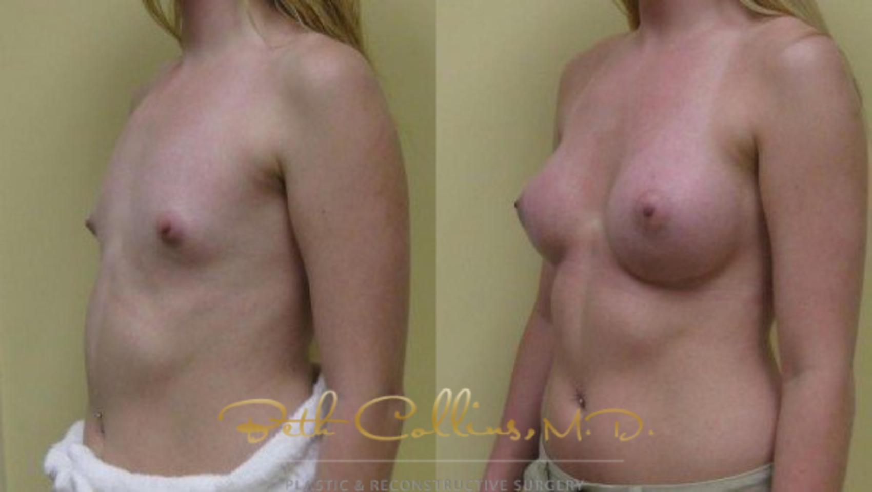 This young lady was very unhappy with the fact that her breast failed to develop. She complained that she felt as if she “looked like a young boy instead of a young woman”. She wanted to have a small augmentation to change this, but she did not want to be too large. Because had little to no breast tissue to cover the top of an implant, a decision was made to use the dual plane technique. In this technique, the pectorals muscle is lifted and a pocket is created under the muscle to accommodate the implant. The center portion of the muscle is then divided from its lower sternal attachemtnns so that the muscle can relax and reflect upward covering the upper portion of the device to give extra bulk and tissue to hide the edge of the implant and avoid effects of visible rippling. The lower portion of the device is then allowed to relax into the lower pole of the breast giving it a rounded, natural appearance. This was transformative for this young lady who now says that she is “finally comfortable in her own body”.