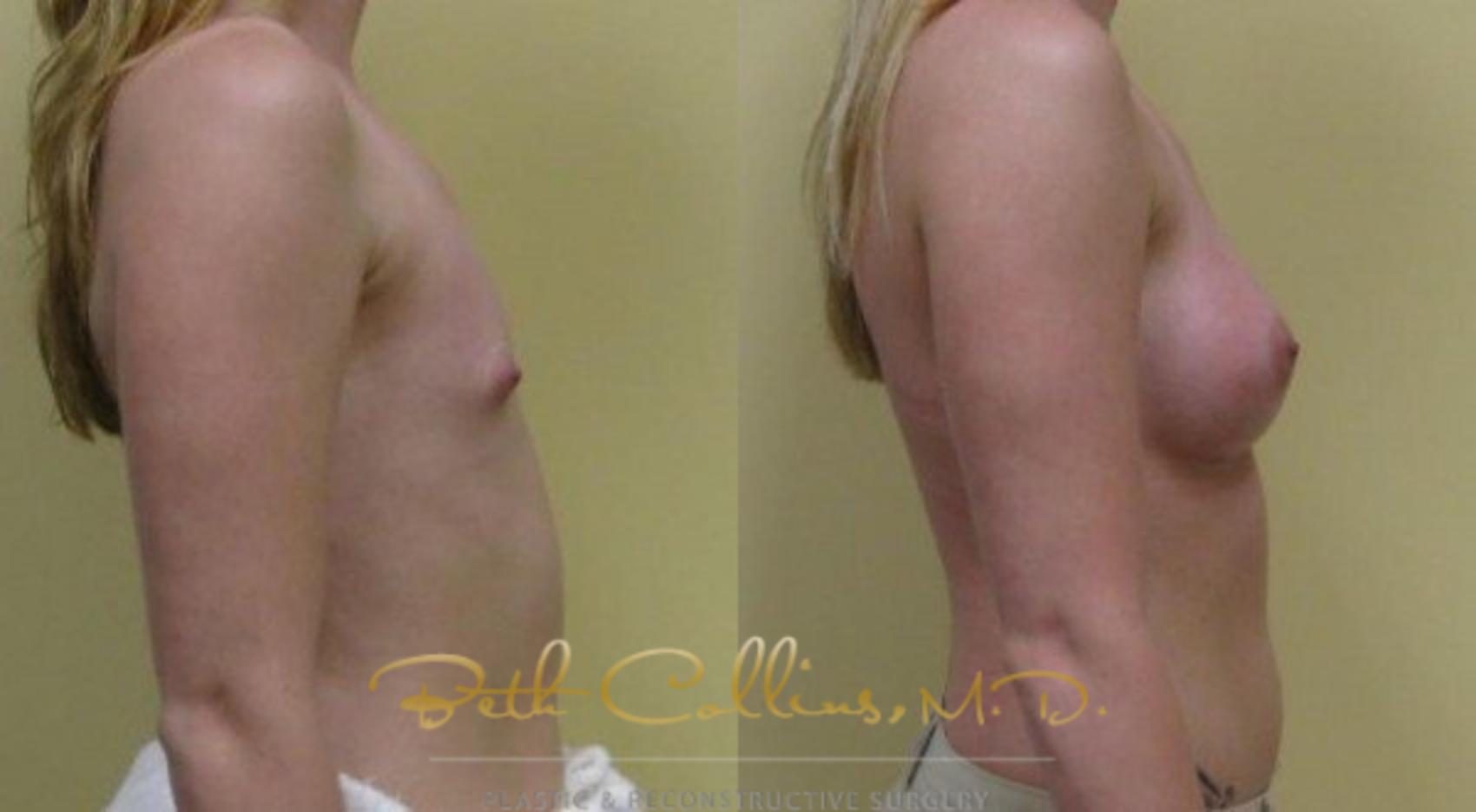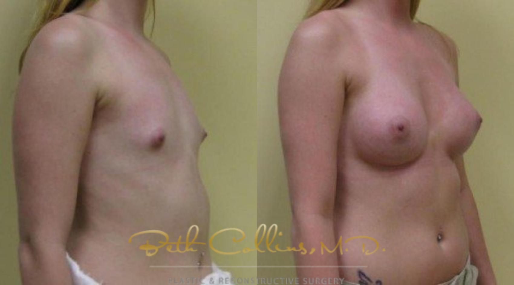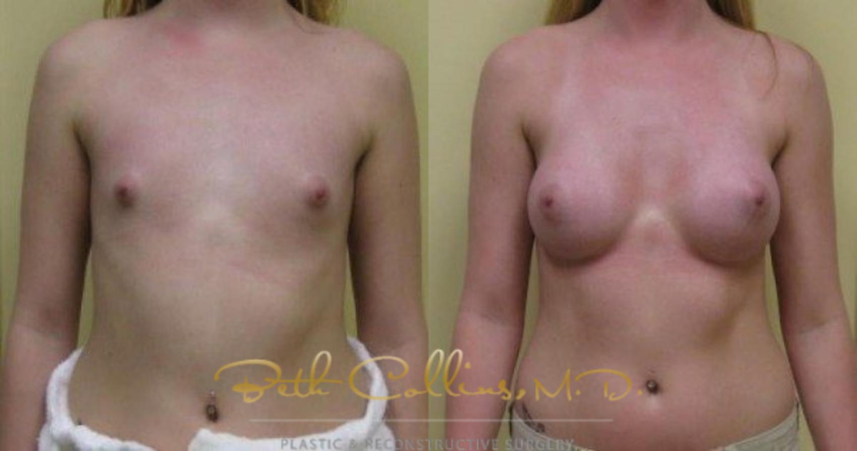 This young lady was very unhappy with the fact that her breast failed to develop. She complained that she felt as if she “looked like a young boy instead of a young woman”. She wanted to have a small augmentation to change this, but she did not want to be too large. Because had little to no breast tissue to cover the top of an implant, a decision was made to use the dual plane technique. In this technique, the pectorals muscle is lifted and a pocket is created under the muscle to accommodate the implant. The center portion of the muscle is then divided from its lower sternal attachemtnns so that the muscle can relax and reflect upward covering the upper portion of the device to give extra bulk and tissue to hide the edge of the implant and avoid effects of visible rippling. The lower portion of the device is then allowed to relax into the lower pole of the breast giving it a rounded, natural appearance. This was transformative for this young lady who now says that she is “finally comfortable in her own body”.