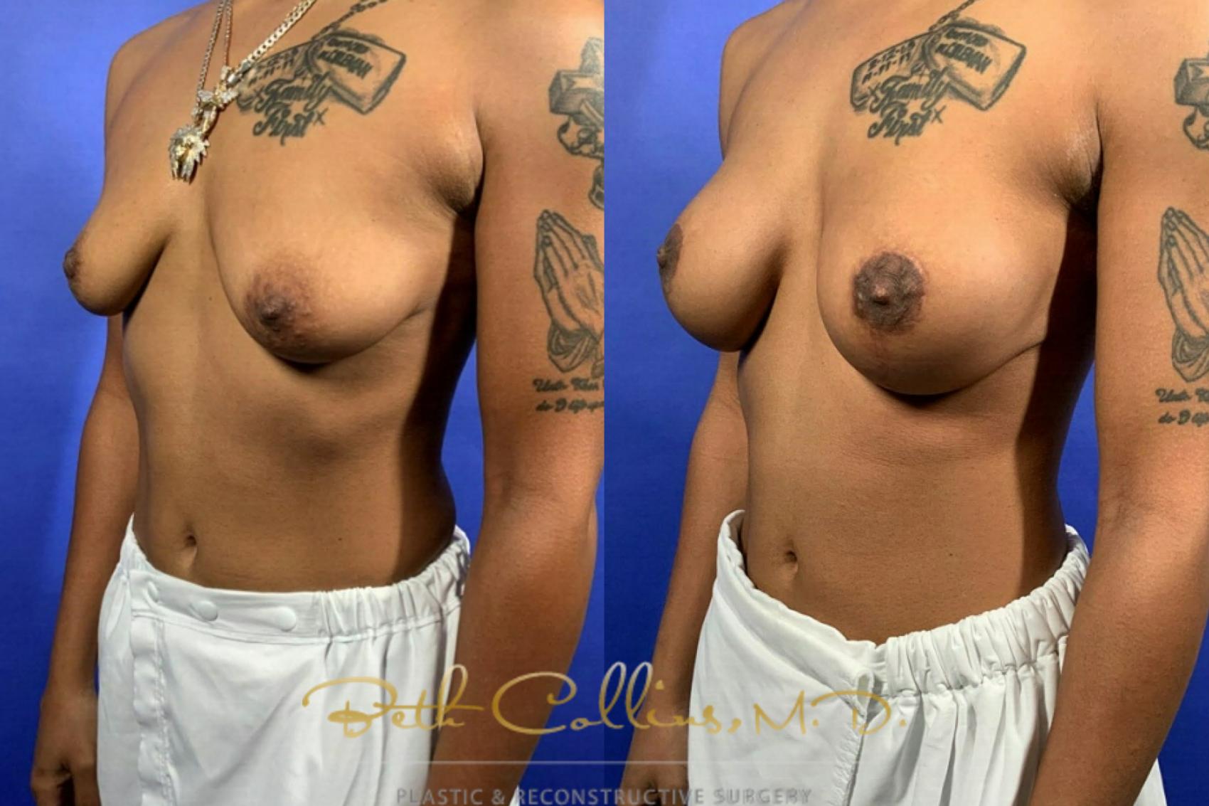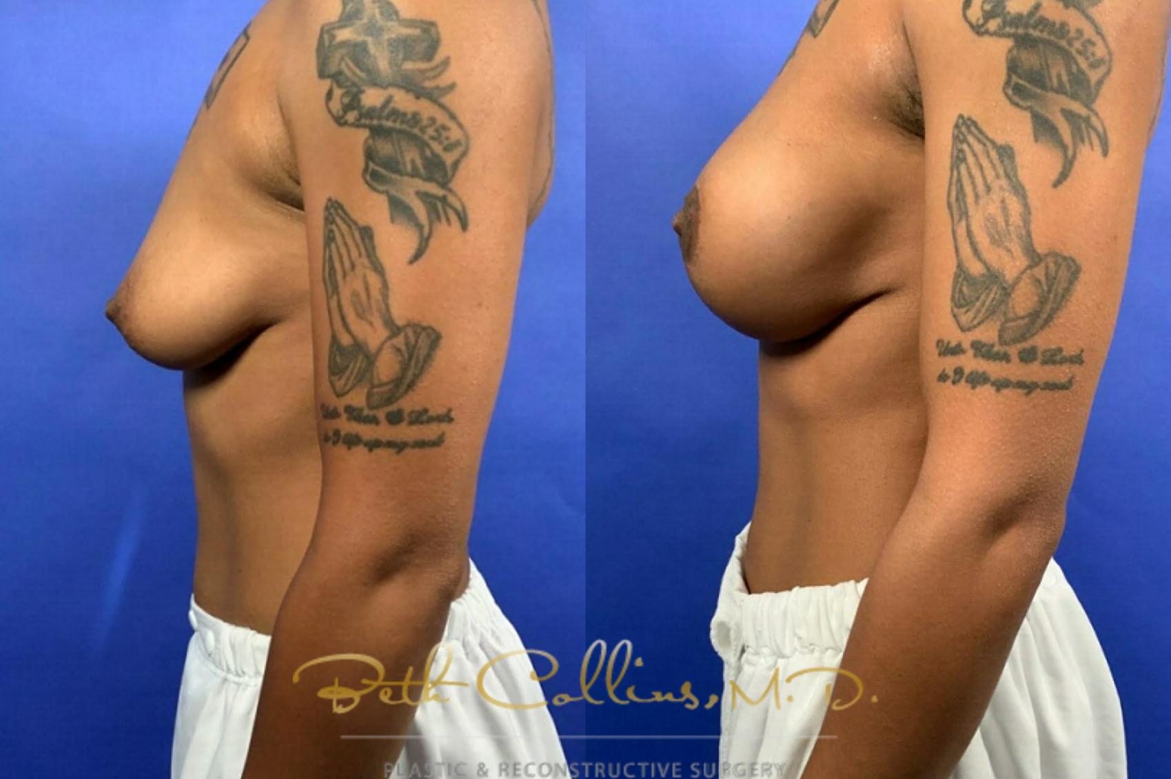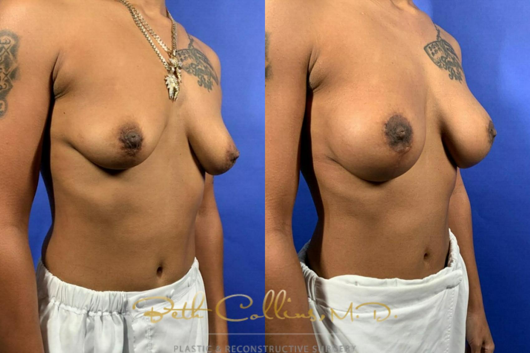 This patient was unhappy with the deflated, sagging appearance of her breasts. She wanted a modest augmentation with a lift of the nipple/areola complex. Dr. Collins performed a sub facial silicone gel implant with a superior pedicle breast lift. Her result is very natural and soft.