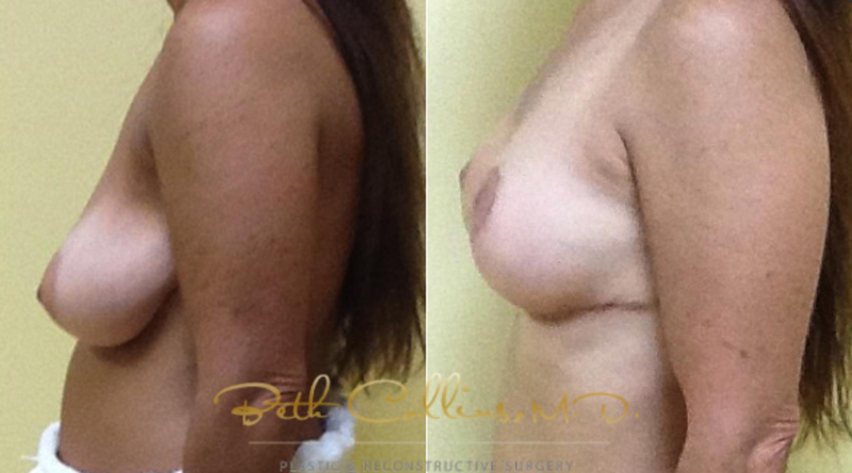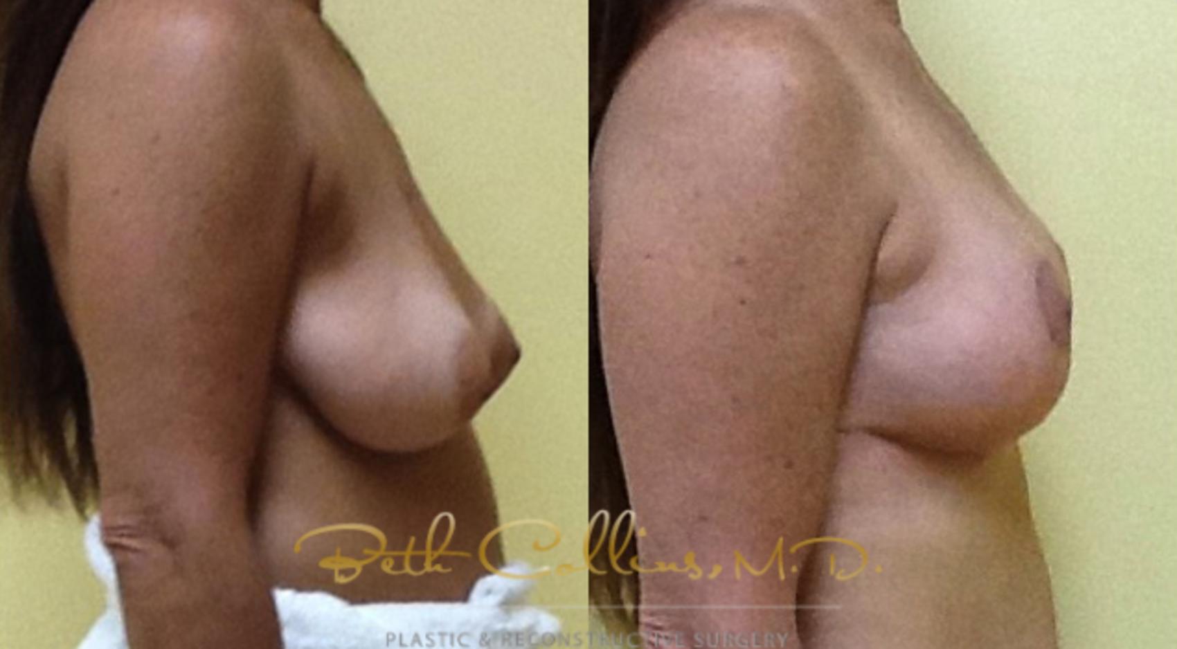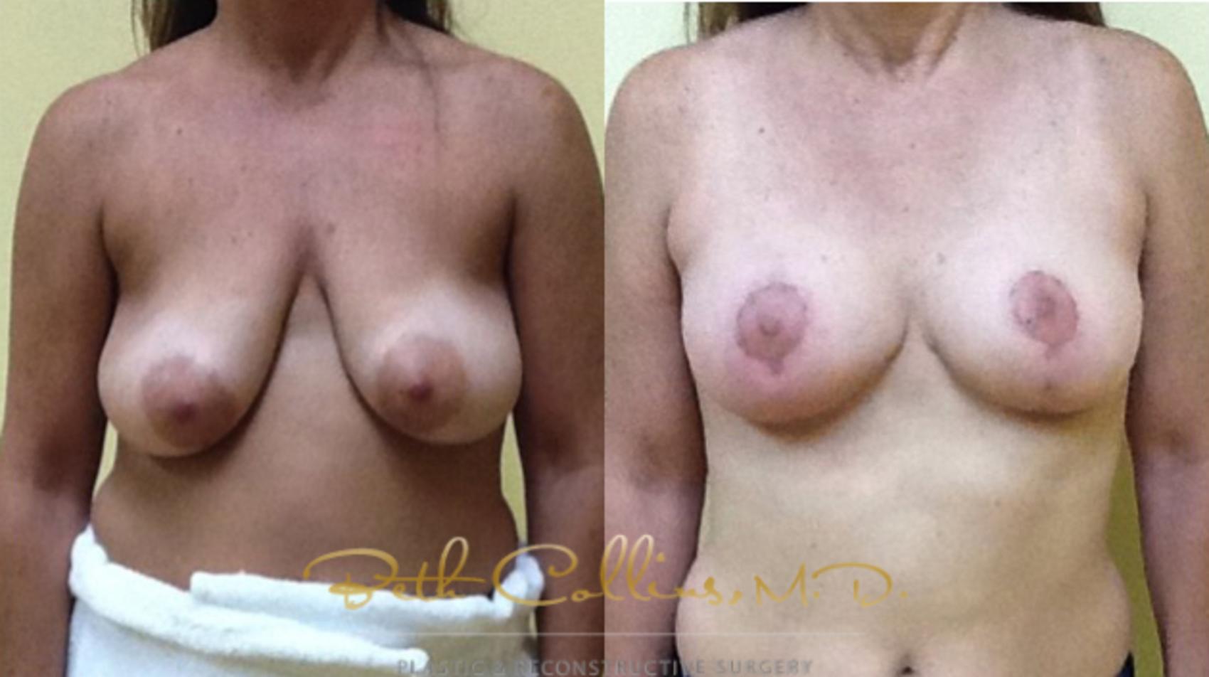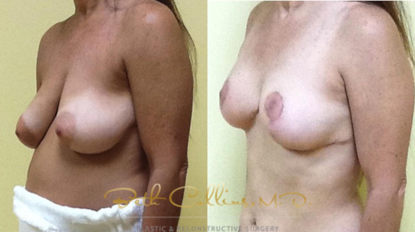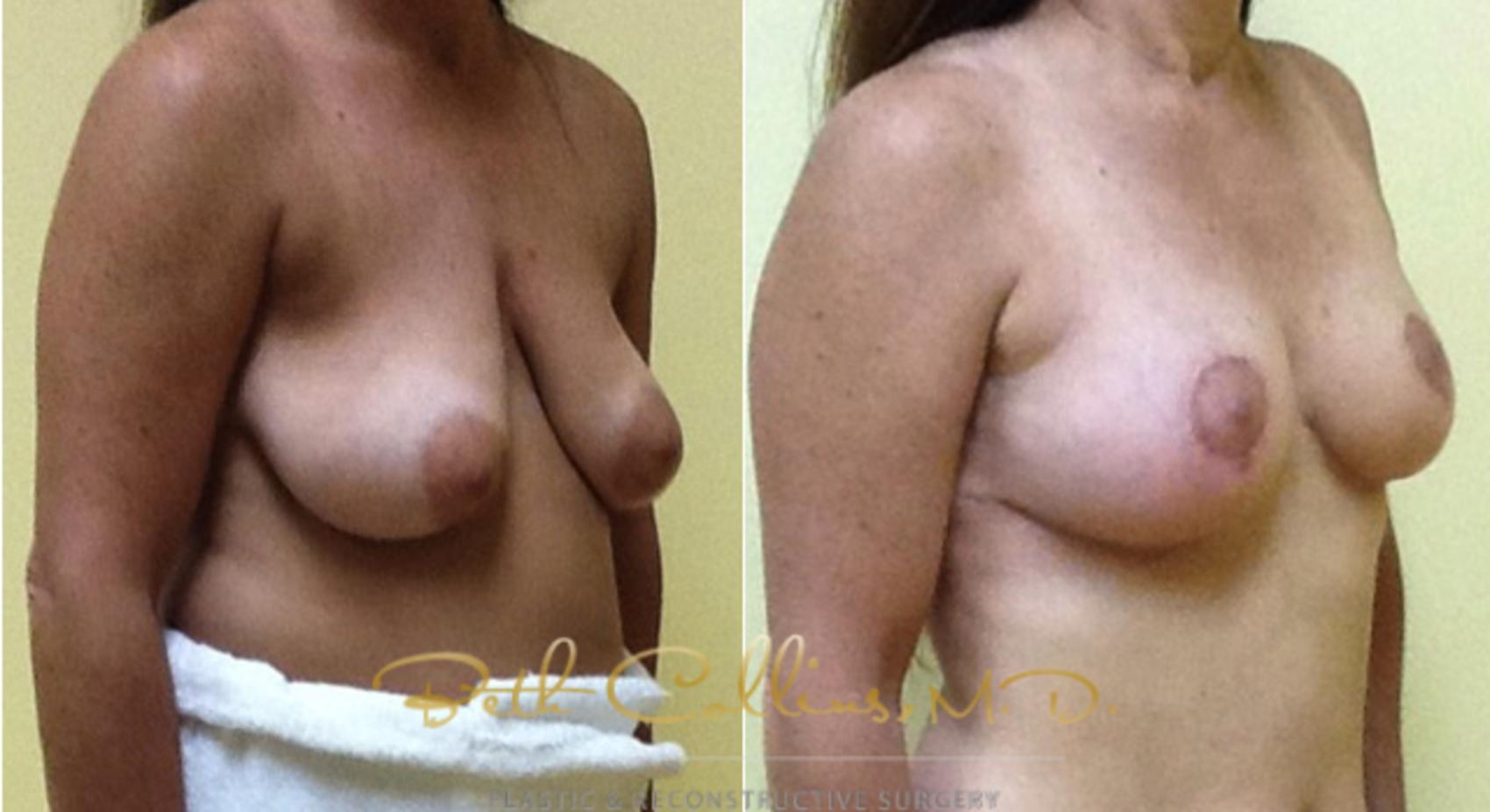 This patient came in to see Dr. Collins for consideration of breast implants. After a long conversation, it was clear that really what this patient wanted was to improve the shape of her breasts and to move the nipple to a more attractive location on her breasts. She had plenty of volume in her breasts and really didn’t want to be any bigger. Instead of a breast augmentation, this patient had a breast lift/small reduction. By reshaping and redistributing the tissue that was already present in her breasts, the effect was that her shape was improved, her nipples were placed in an elevated more attractive position and the patient had the effect of implants without actually having implants. This is possible in patients who have good breast volume to begin, as she did.
