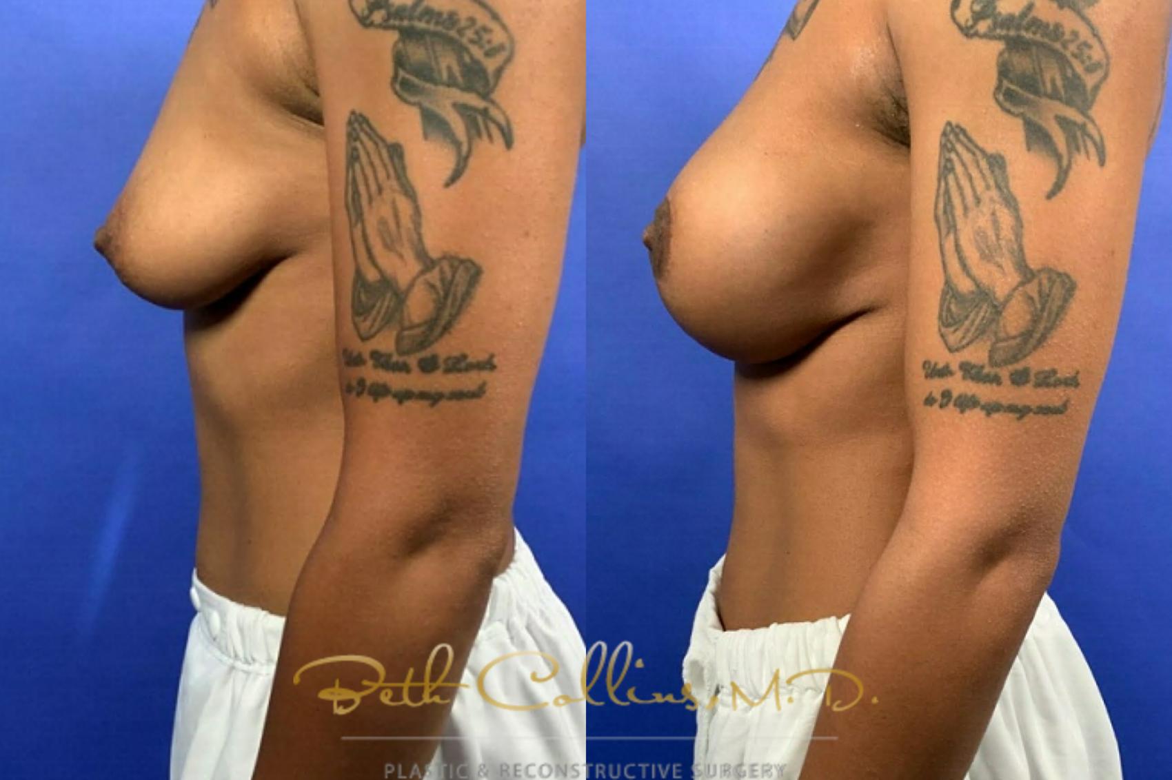 Deflated sagging breasts that lack upper pole fill can give an aged appearance. With small silicon gel implants and a mastopexy, this lady has breasts that are both full on the top (or upper pole) and with a lifted perkier appearance