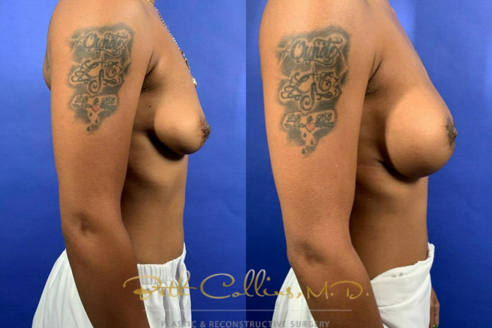 This patient was unhappy with the deflated, sagging appearance of her breasts. She wanted a modest augmentation with a lift of the nipple/areola complex. Dr. Collins performed a sub facial silicone gel implant with a superior pedicle breast lift. Her result is very natural and soft.