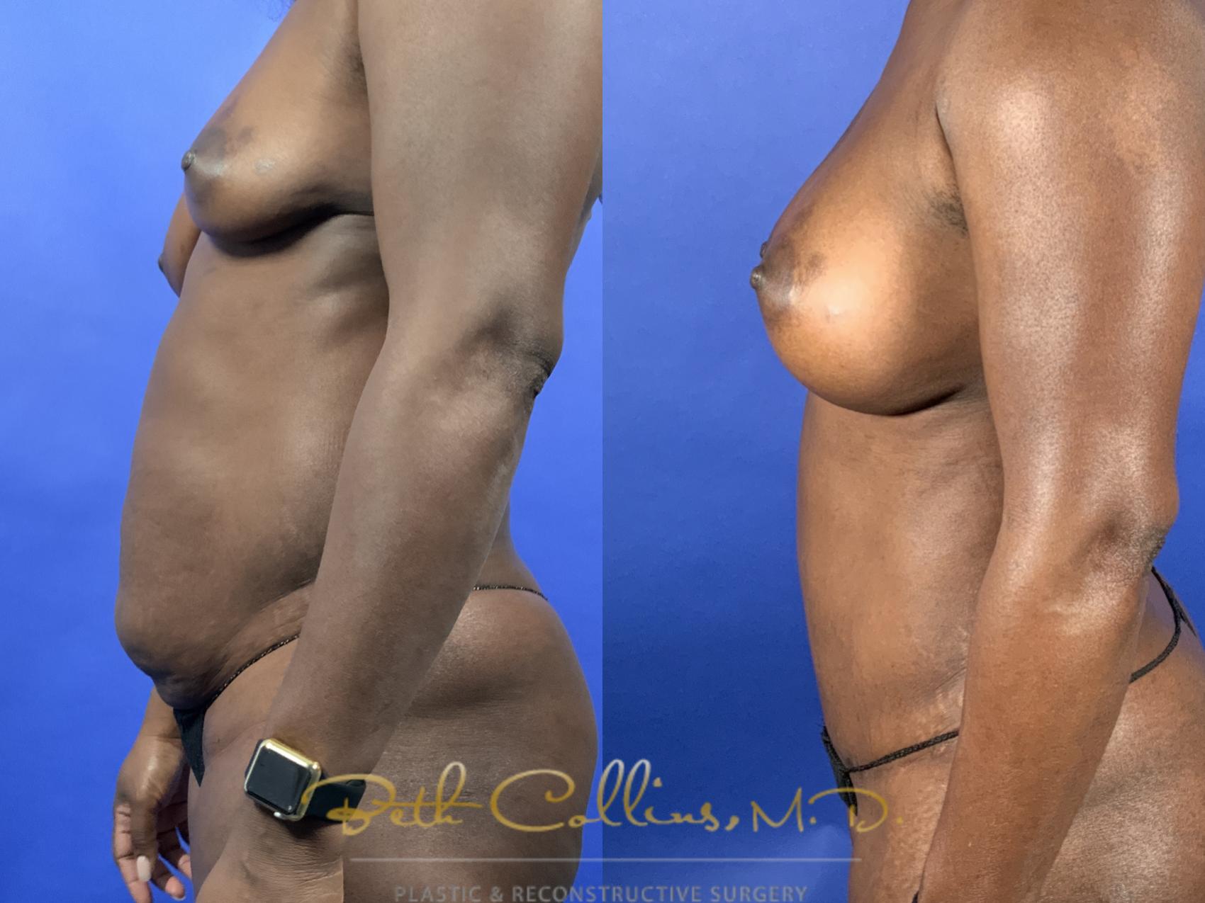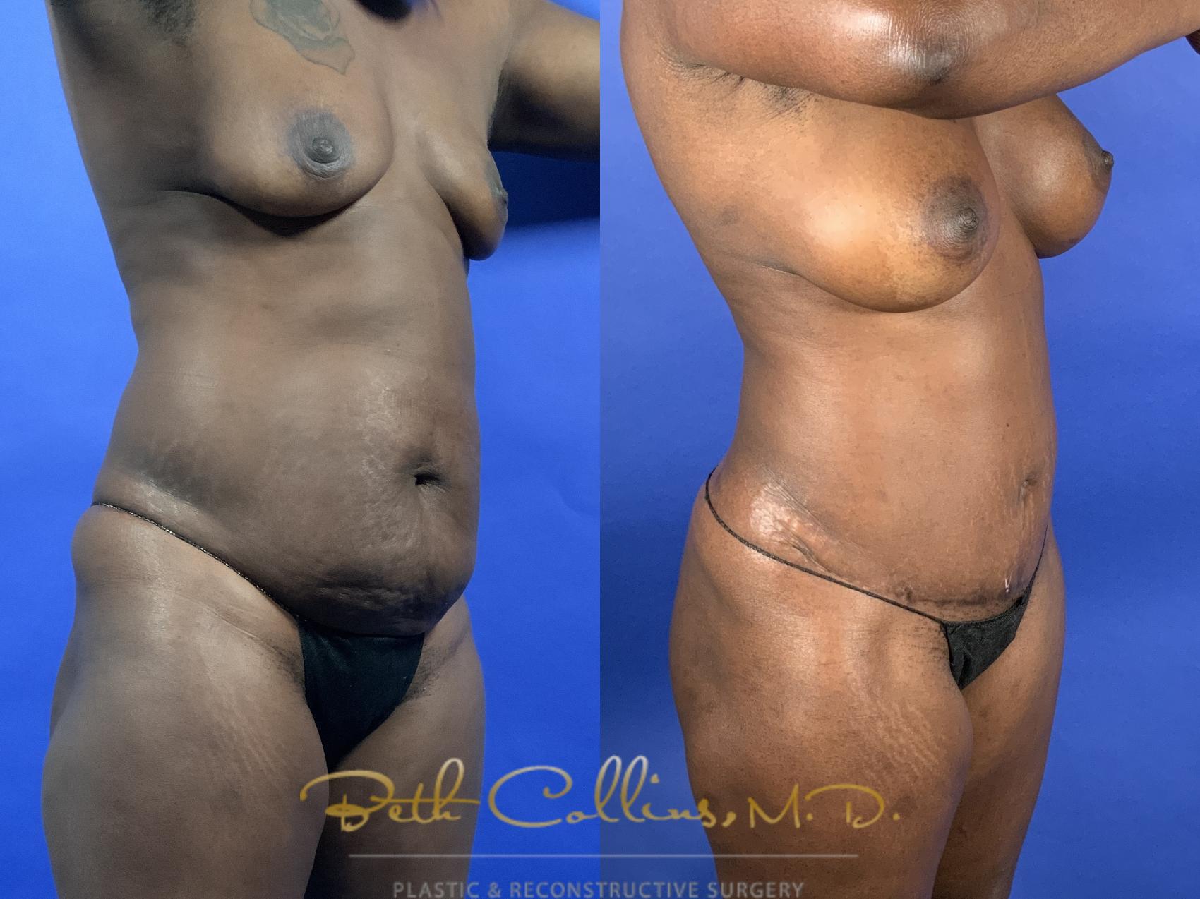 Mommy Makeover: With pregnancy comes stretching and ultimately wrinkling and sagging. This can present itself in many different ways. Most often, women seeking a mommy makeover want something done to their abdomen and breasts. This lovely lady was in great shape, but her breasts were deflated and she hated the texture of her skin on her abdomen. We did breast augmentation with gel implants and a tummy tuck to achieve these nice results. Additionally, we did liposuction to her back and flanks to accentuate her narrow waistline and to really highlight her beautiful curves.