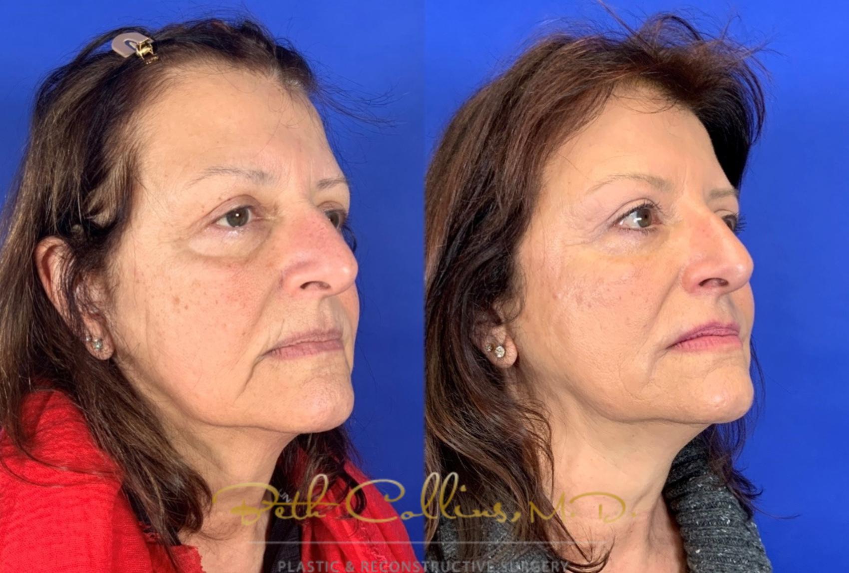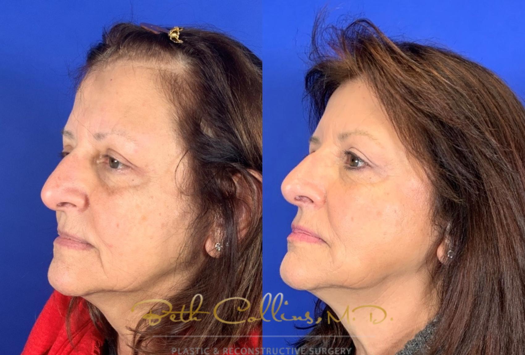 This woman was unhappy with the signs of aging on her face. She had noticeable hollows under her eyes and sagging in her cheeks, making her look older than she feels. With some dermal filler injections, all we can say is, “Wow! What a difference!” She looks and feels great.