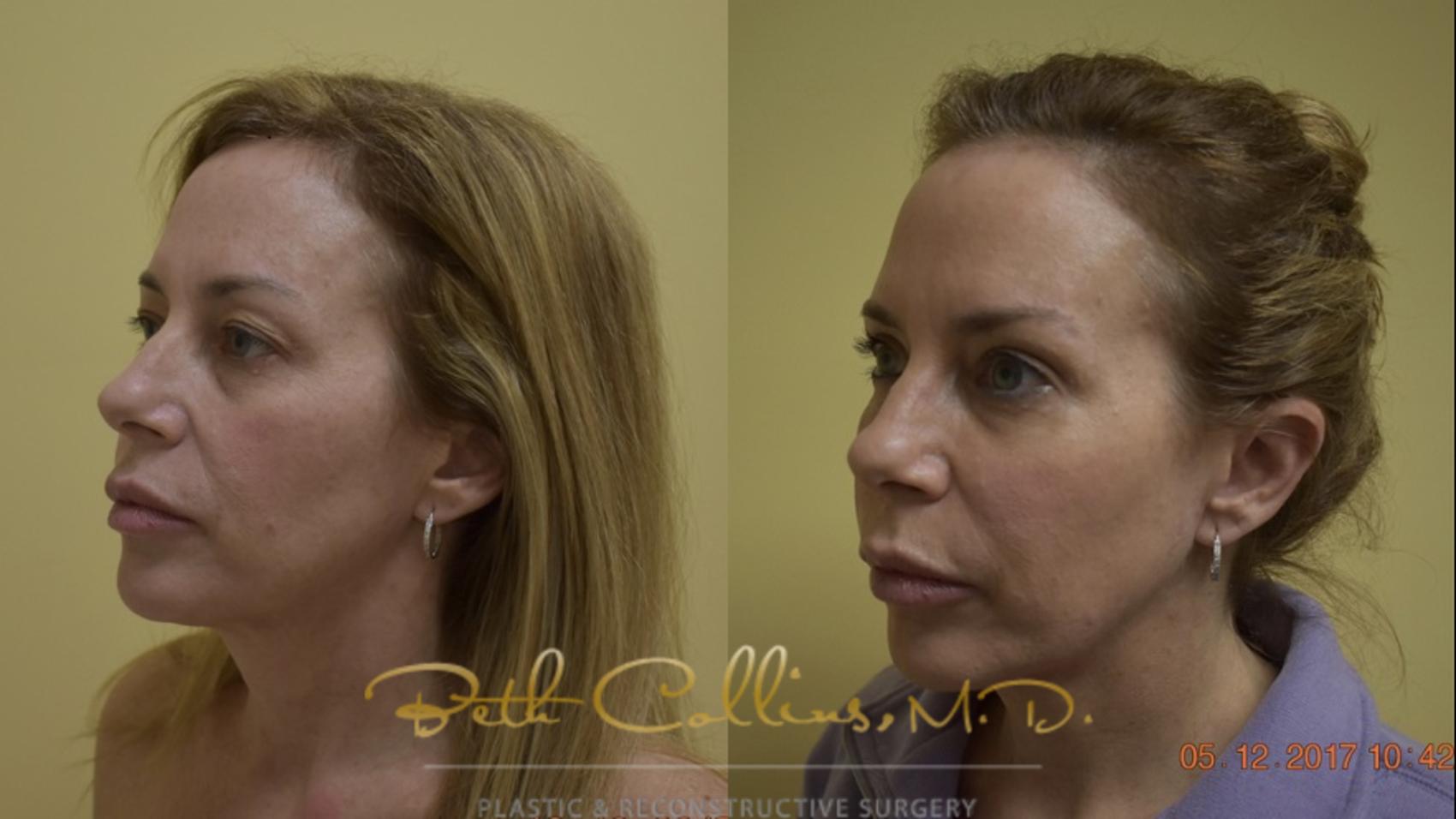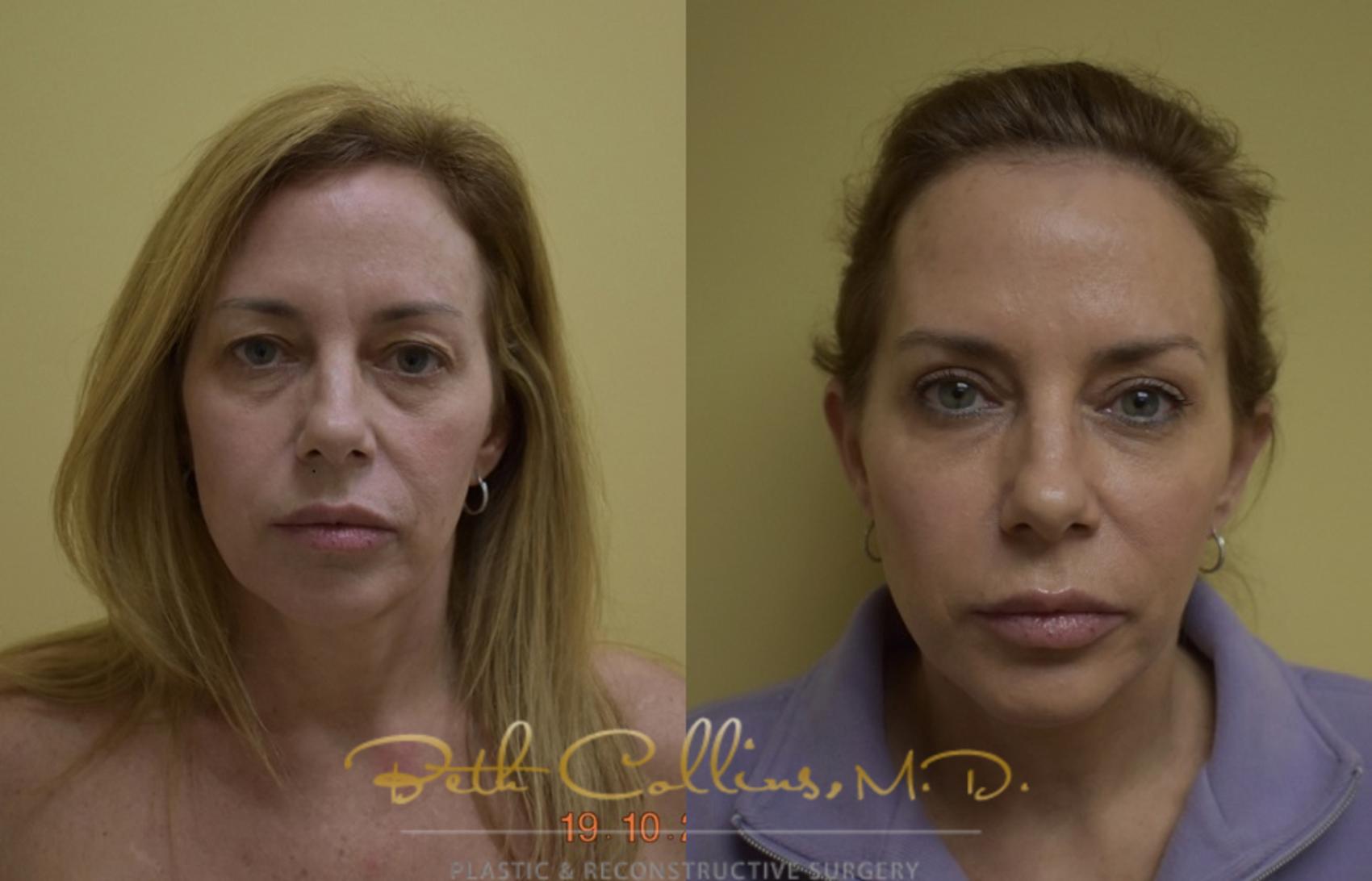 Together they decided to do an upper lid blepharoplasty and to restore some of the volume to her cheeks using hyaluronic acid fillers (Voluma and Juvederm). Dr. Collins did the blepharoplasty in her office under local anesthesia. Following the surgery, she put just enough filler into her cheek area that had lost its youthful volume and after just one hour of treatments, her natural youthful beauty is restored. The pictures are four weeks apart.
