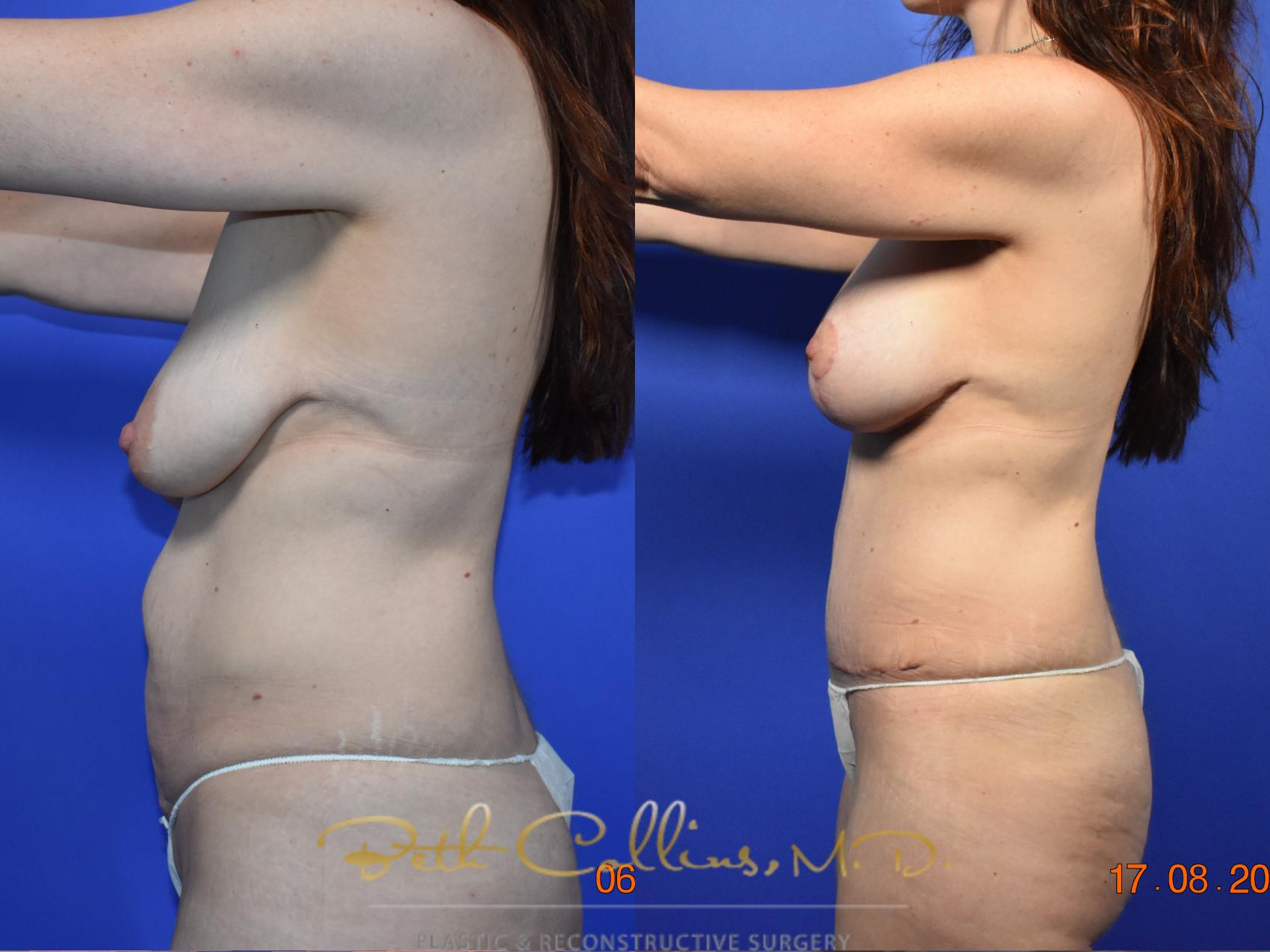 A mommy makeover can mean a number of different things involving correction of problems caused by pregnancy. Most often this involves surgery of the breast and abdomen, but can also involve other areas of the body. In this case, this patient complained of sagging breasts and excess fat and skin on her abdomen. To correct her issues, an augmentation mamma-platt with mastopexy were performed at the same time that the patient had a tummy tuck (abdominoplasty). In one surgery, all areas of complaint were fixed with one recovery.