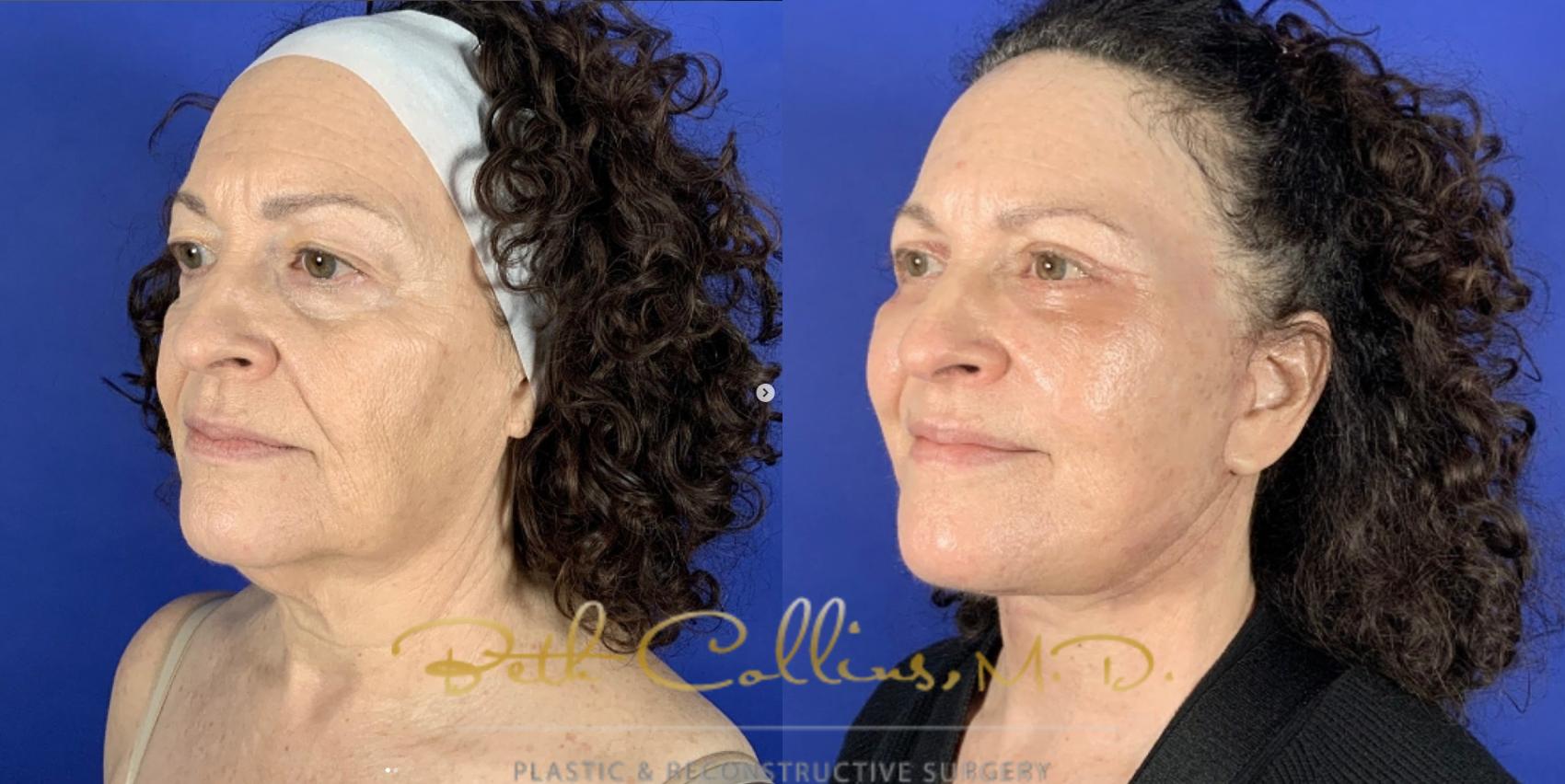 There is no amount of filler or “skin tightening” devices that will give you a result like this. Do not add filler to your jawline and nasolabial folds or cheeks thinking that you will lift your neck or sharpen your jaw line. It is an anatomic impossibility. Only surgery will get you from point A to point B. Filler is a wonderful tool in properly selected patients. Please make sure that if you are going to a med spa, make sure that they are owned and operated by someone in the medical field. If you don’t, you will be a victim of the commodities market. A good injector would tell you in a case like this that surgery is the best path to a naturally rejuvenated look. This patient is only one month out. This result will continue to improve, but we already think she looks fabulous. Dr. Collins did a deep plane facelift with upper and lower eyelid surgery and an endoscopic brow lift.