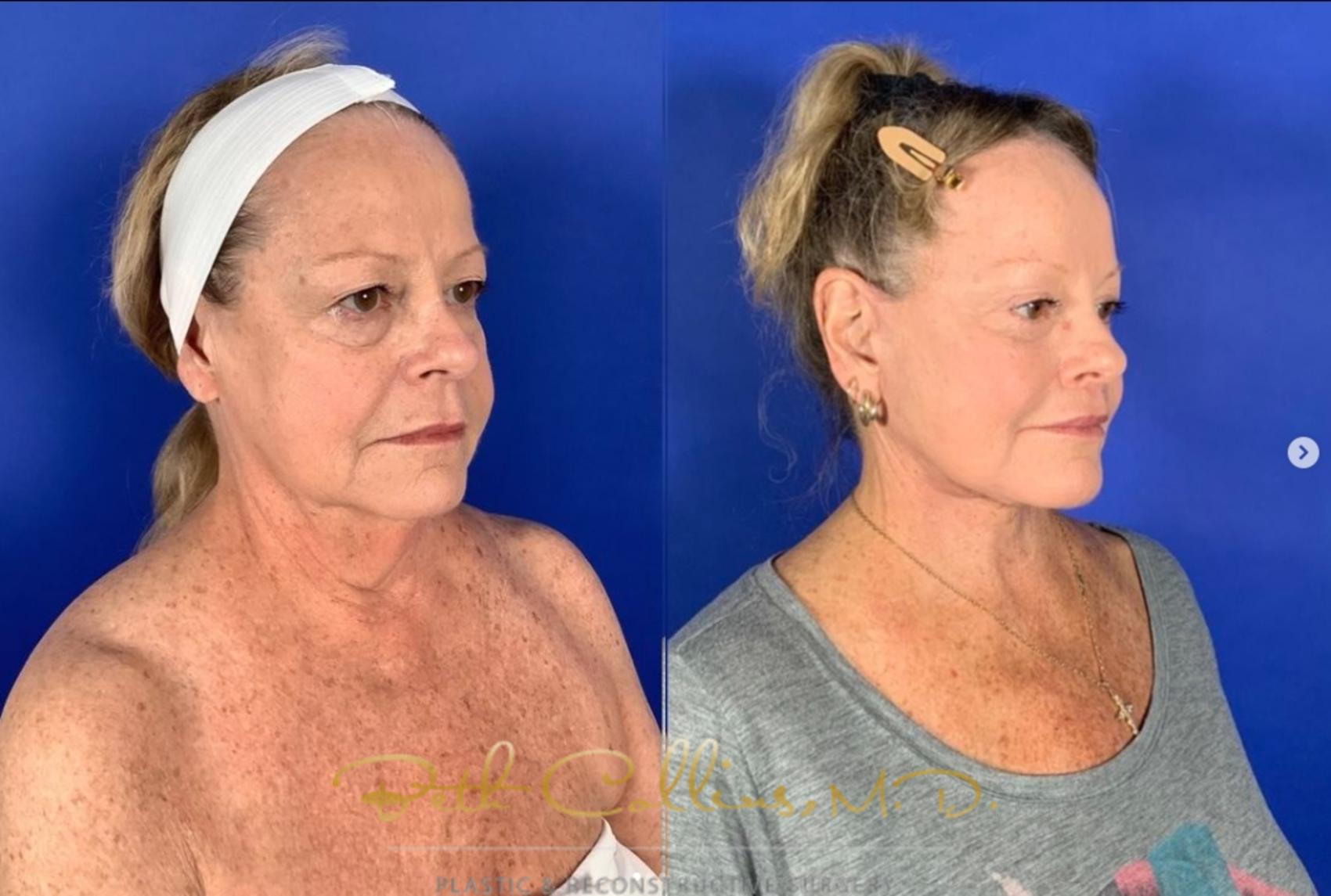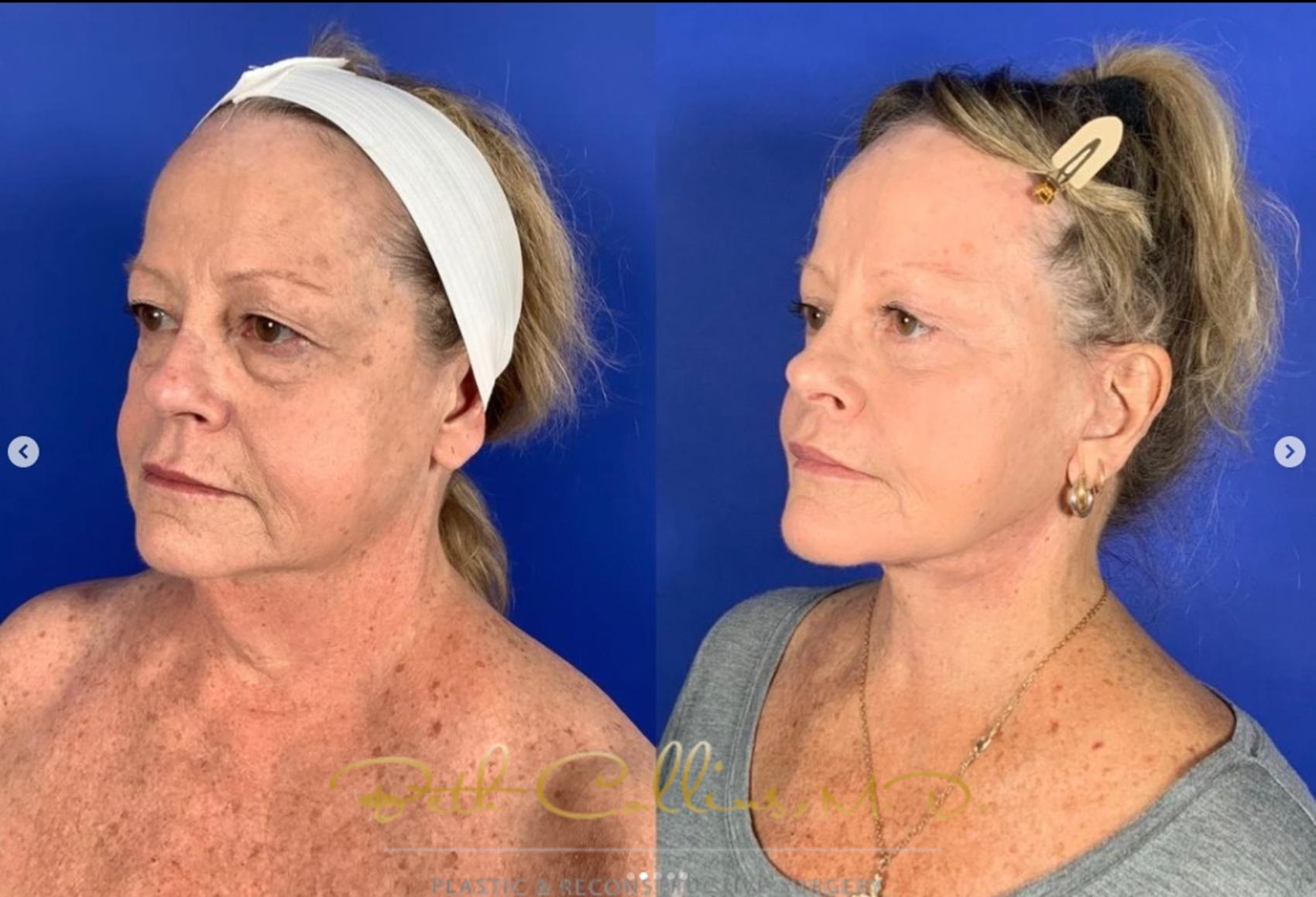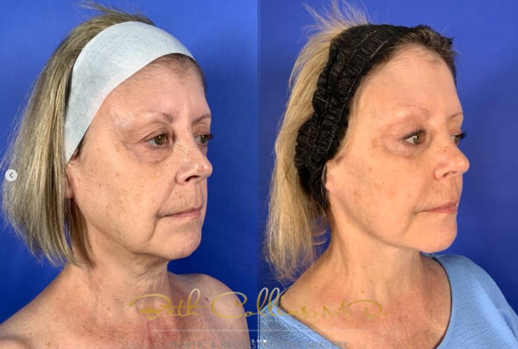 Dr. Collins is an expert in facelift surgery. She has a particular interest in treating patients with a “heavy neck”. With techniques of deep plane facelift, Dr. Collins effectively and predictably corrects all the deep structures in the neck leading to correction of the hanging neck, sharpening of the jawline and lifting the sagging tissues of the face and jowls. This beautiful patient had a brow lift, upper and lower lid blepharoplasty to correct the issues that were making her eyes look tired. She had a lower face and neck lift at the same time. She is thrilled with her results, and we are too.