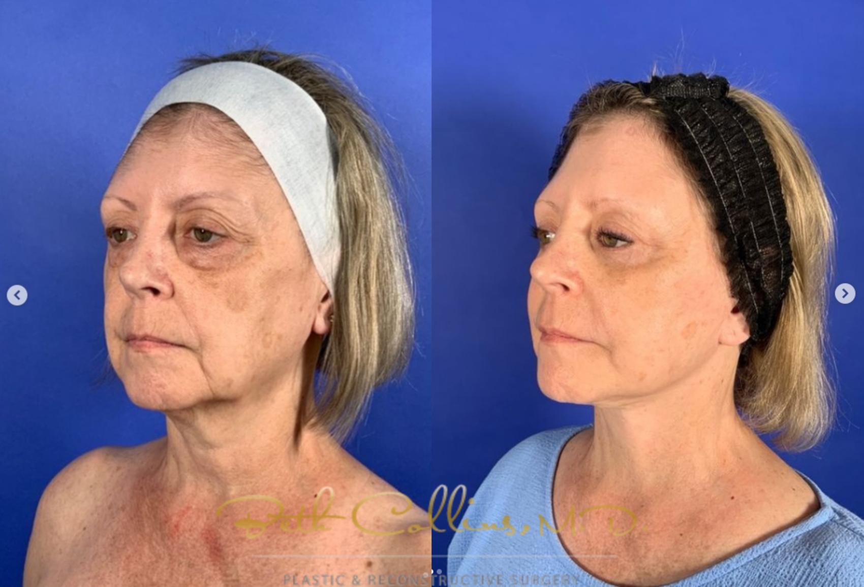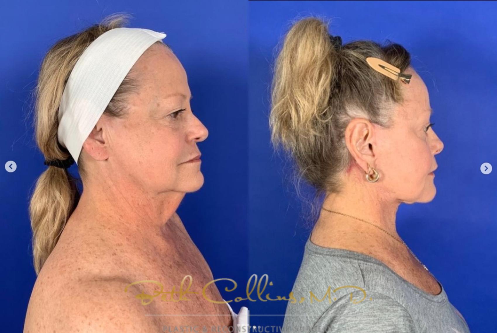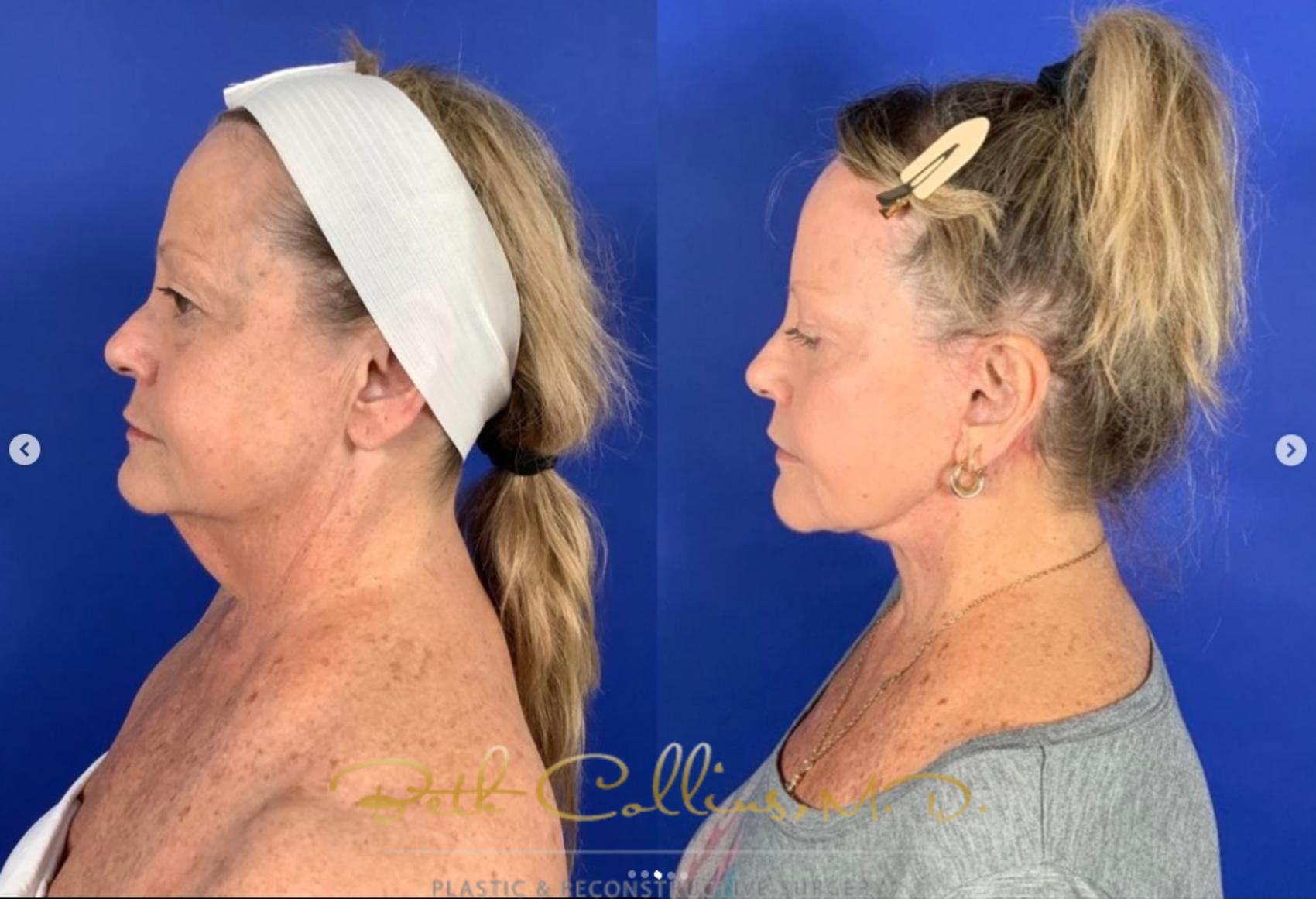 Dr. Collins is an expert in facelift surgery. She has a particular interest in treating patients with a “heavy neck”. With techniques of deep plane facelift, Dr. Collins effectively and predictably corrects all the deep structures in the neck leading to correction of the hanging neck, sharpening of the jawline and lifting the sagging tissues of the face and jowls. This beautiful patient had a brow lift, upper and lower lid blepharoplasty to correct the issues that were making her eyes look tired. She had a lower face and neck lift at the same time. She is thrilled with her results, and we are too.