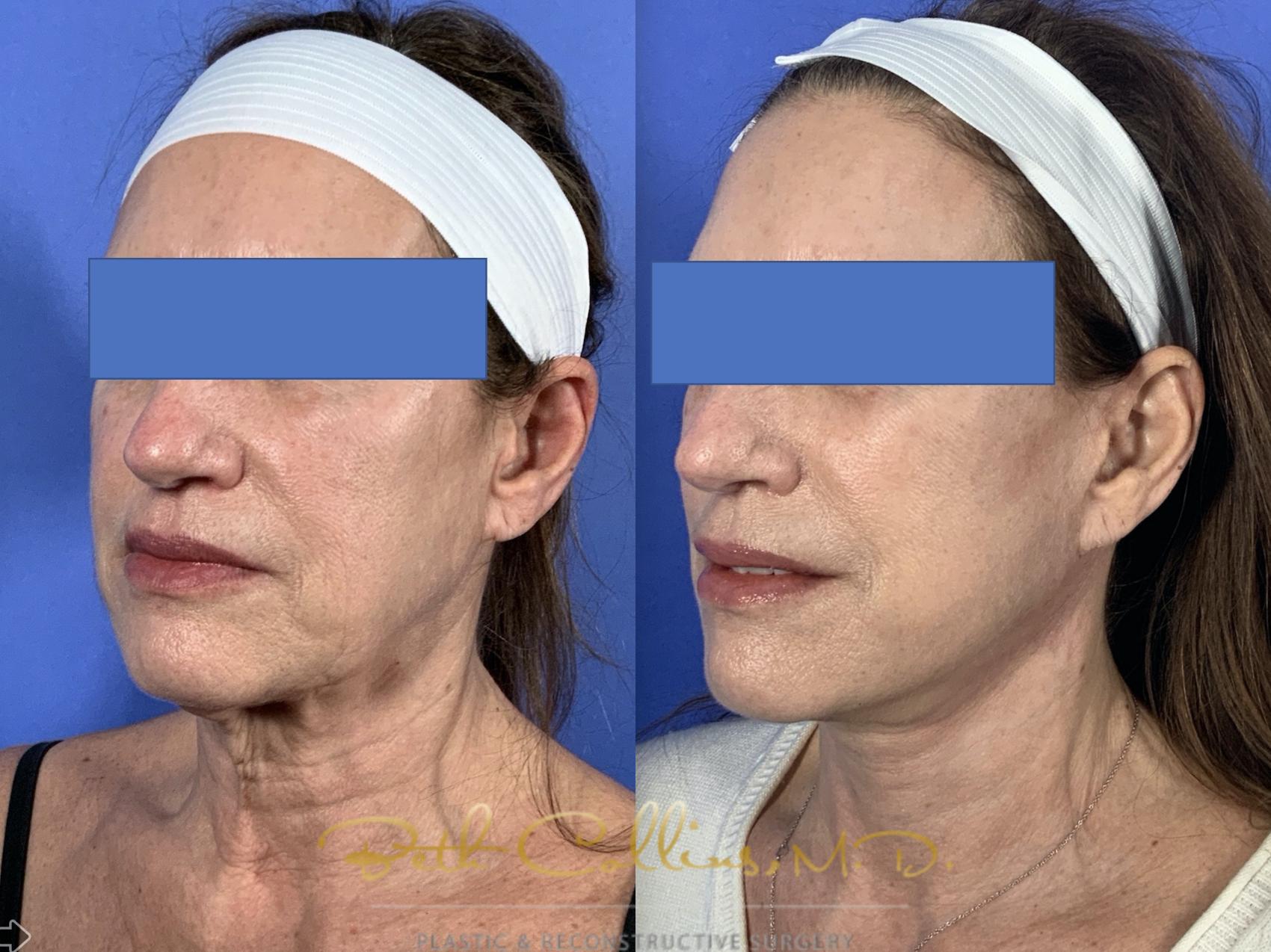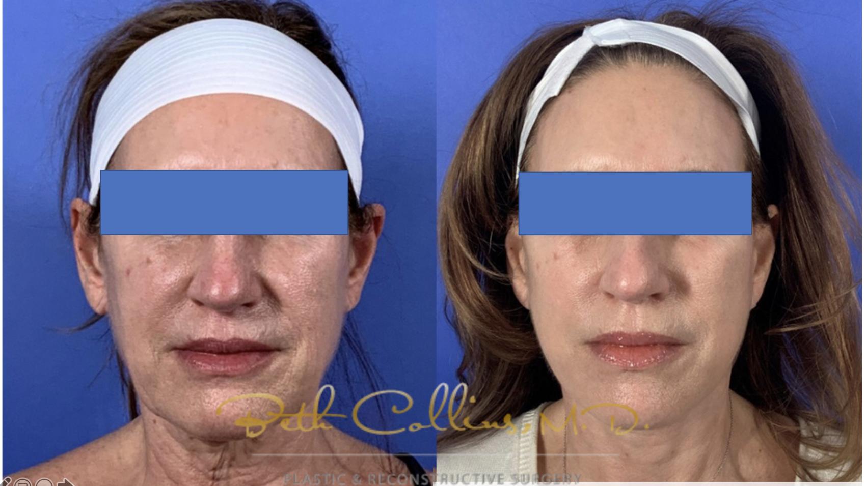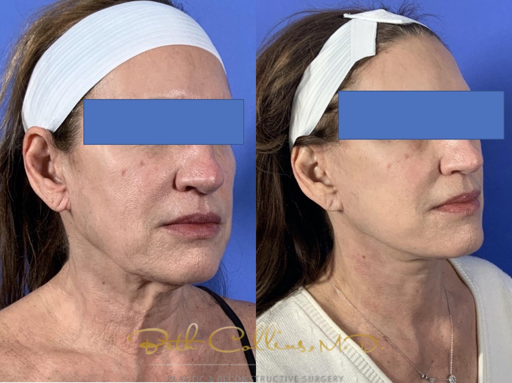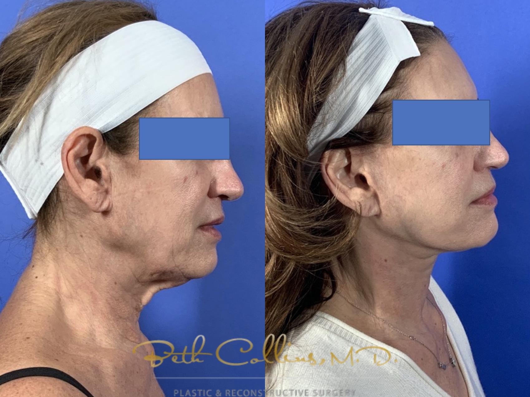 This beautiful lady came to have a lower face and neck lift with fat grafting. As so many say, she felt as if the outside didn’t match the inside and she wanted to definitively fix the sagging skin in her neck and lower face. Dr. Collins performed a deep plane, high lamellar SMAS facelift to recon tour her lower face and neck. The result is a sharp and well defined jawline and a softer more youthful appearance.