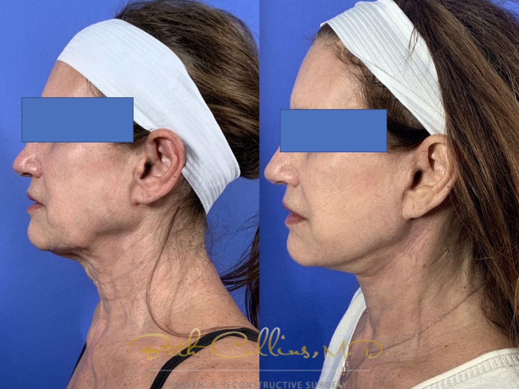 This beautiful lady came to have a lower face and neck lift with fat grafting. As so many say, she felt as if the outside didn’t match the inside and she wanted to definitively fix the sagging skin in her neck and lower face. Dr. Collins performed a deep plane, high lamellar SMAS facelift to recon tour her lower face and neck. The result is a sharp and well defined jawline and a softer more youthful appearance.
