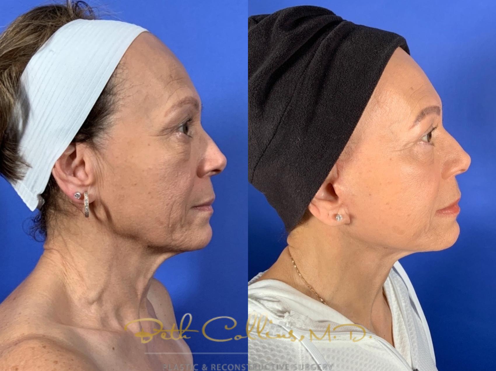 This beautiful lady had a flower face and neck lift and lower lid blepharoplasty to smooth out the banding and excess skin in her neck and jowls and also fix the bags under her eyes. With improvement in the jawline and smoothing if the skin under her eyes, she has a refreshed, younger more beautiful appearance.