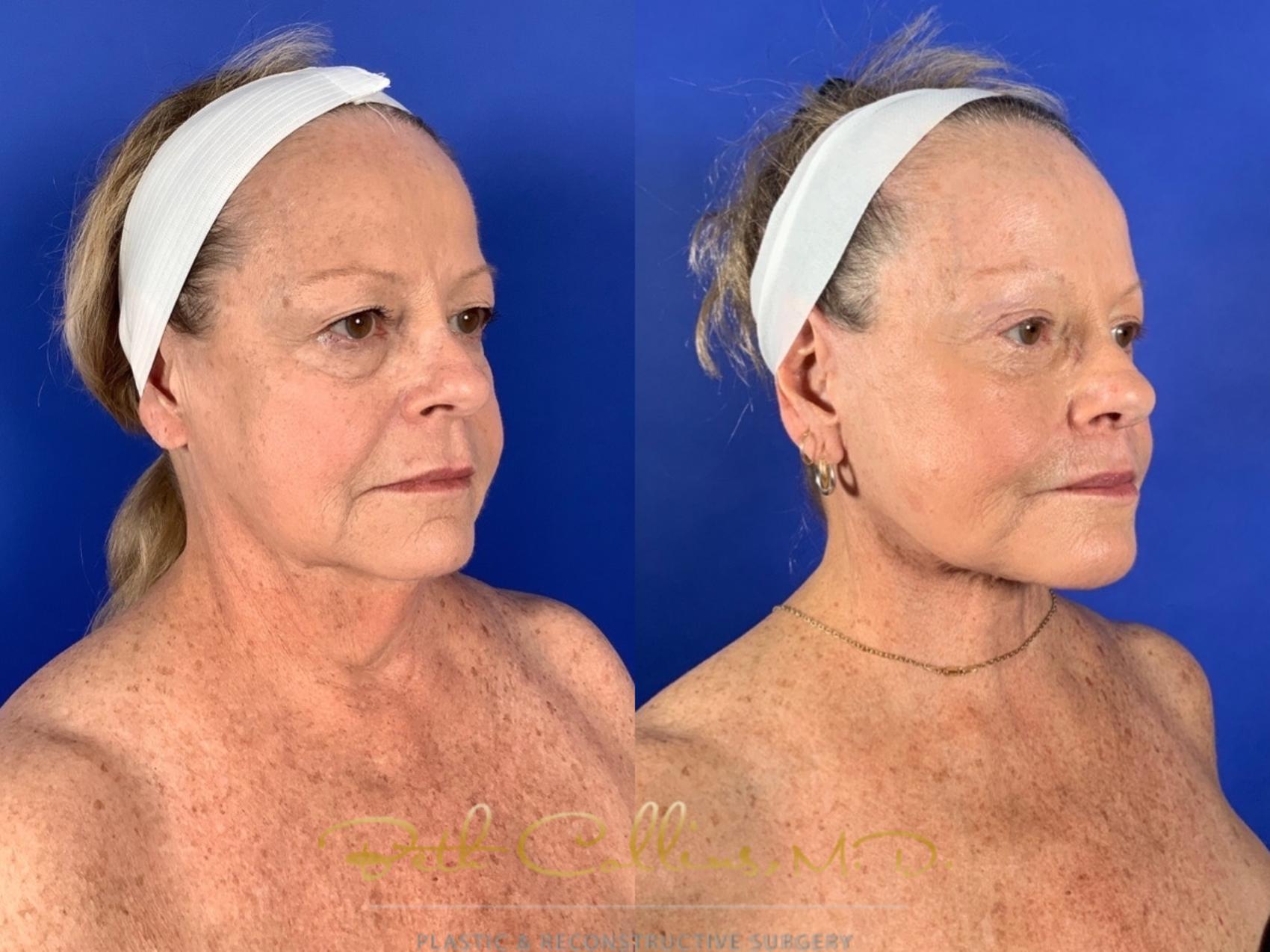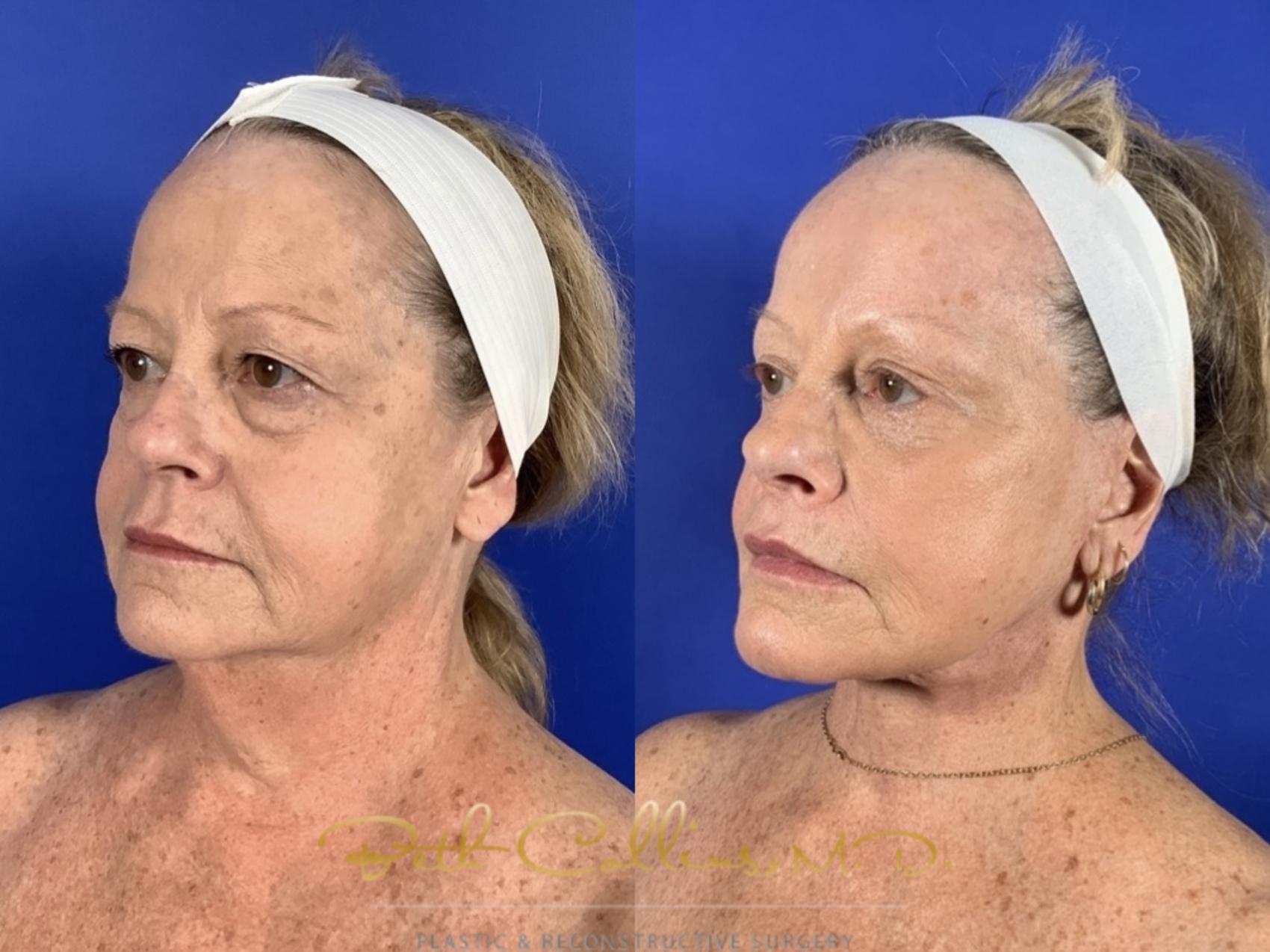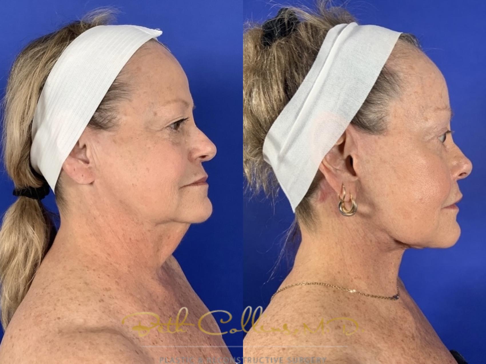 This beautiful patient did not feel that her outside matched what she felt inside. Young at heart, she looked in the mirror and saw someone tired and weary looking back. She wanted a reset and that is what she got!! She had a comprehensive restorative face lift, which included a brow lift, upper and lower lid blepharoplasty, lower face and neck lift with facial fat grafting and upper lip lift. She is continuing her journey with laser treatments to her skin so that she will maintain her results and improve the tone and texture of her skin.