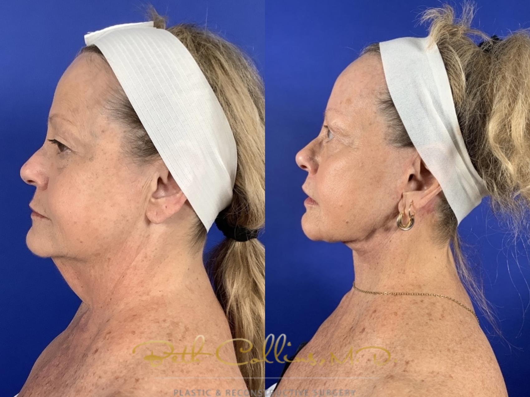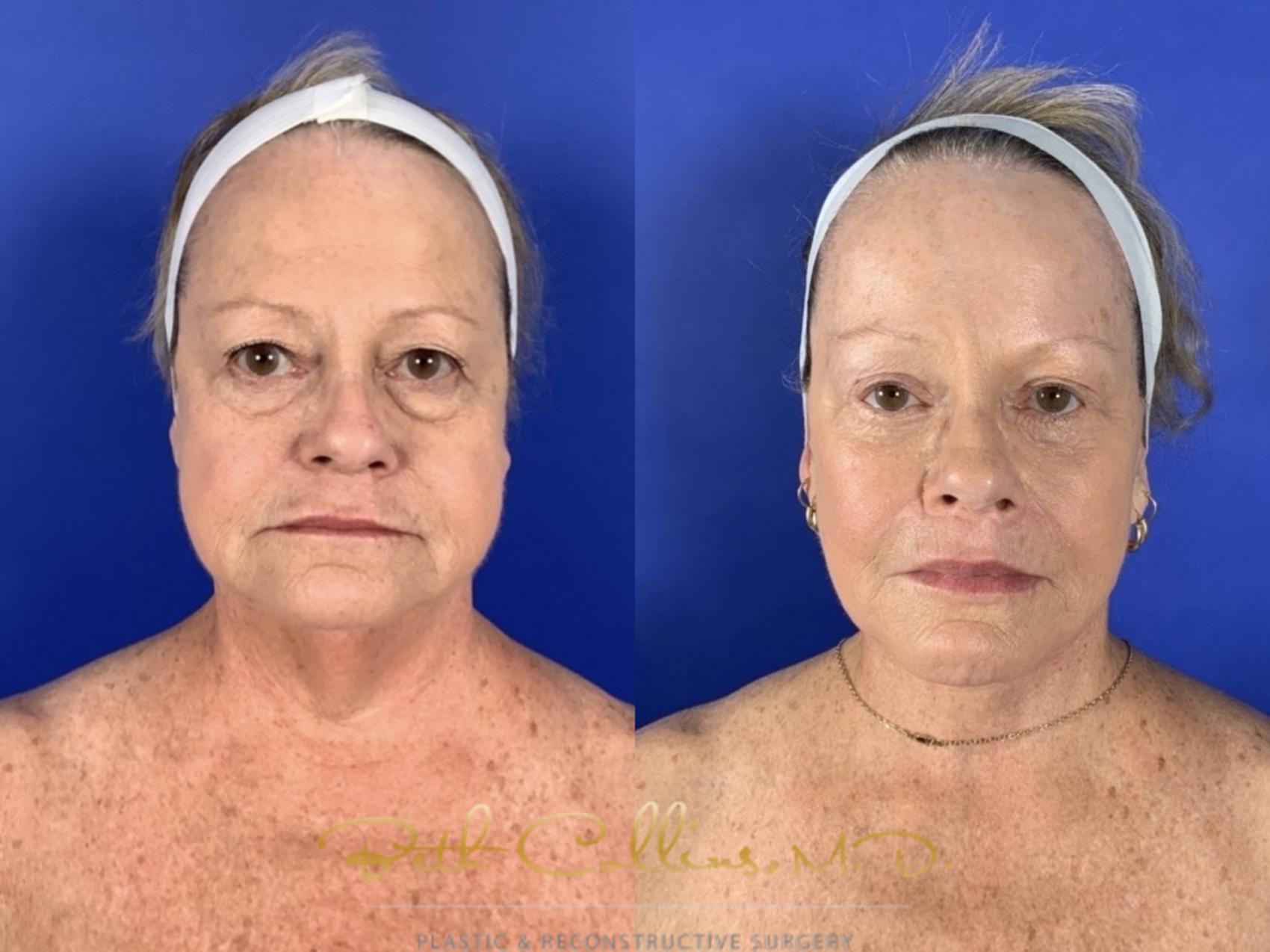 This beautiful patient did not feel that her outside matched what she felt inside. Young at heart, she looked in the mirror and saw someone tired and weary looking back. She wanted a reset and that is what she got!! She had a comprehensive restorative face lift, which included a brow lift, upper and lower lid blepharoplasty, lower face and neck lift with facial fat grafting and upper lip lift. She is continuing her journey with laser treatments to her skin so that she will maintain her results and improve the tone and texture of her skin.