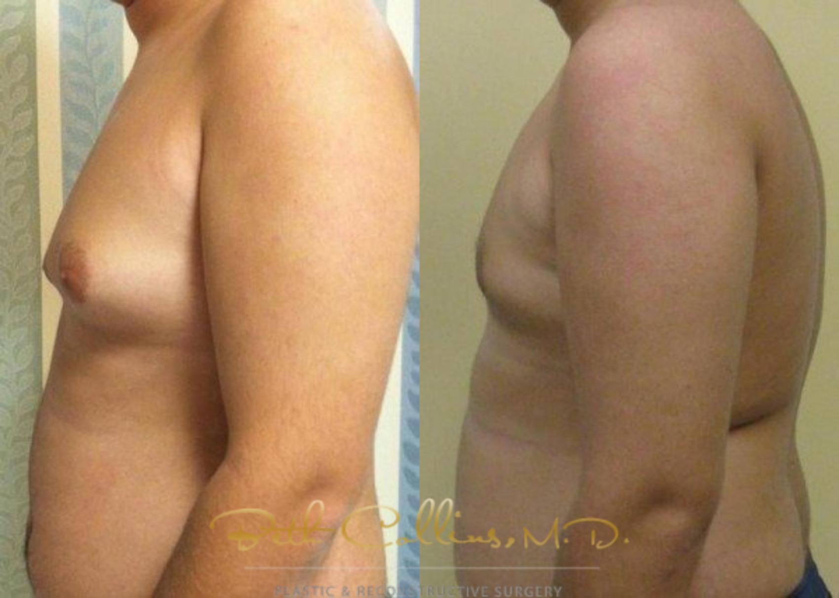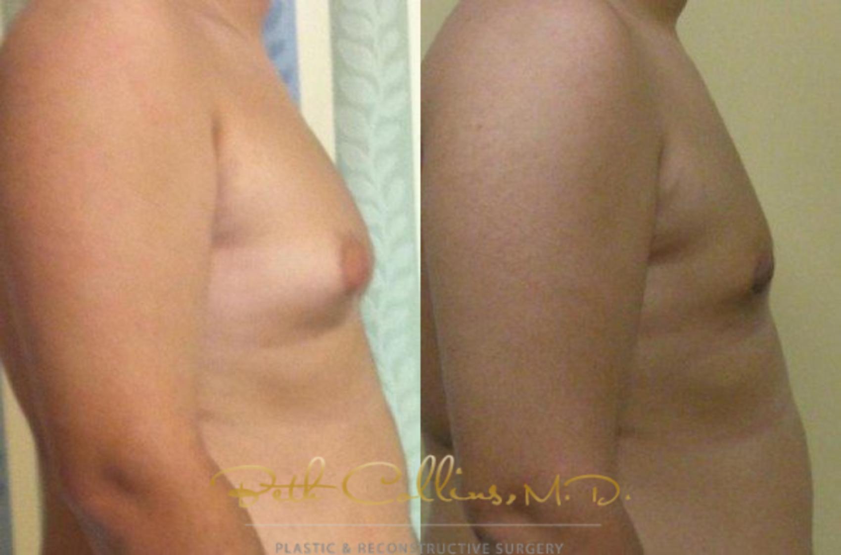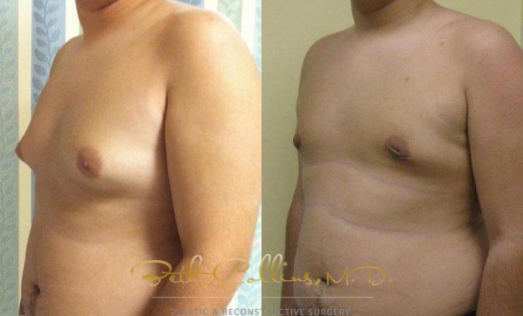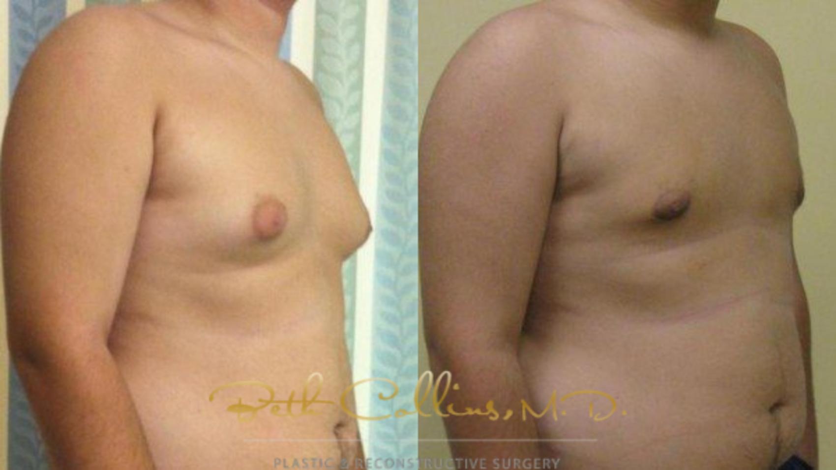 Gynecomastia is a very common problem, affecting up to 30% of all men. It is sometimes associated with being overweight, but almost universally consists of a combination of excess fat and breast tissue. The surgery for this procedure is often a combination of liposuction of the chest wall and direct excision and removal of the breast tissue underlying the nipple. Dr. Collins’ goal is do this with as minimal of an incision as possible so that you can take your shirt off at the beach and feel comfortable. This man had a combination of liposuction and tissue excision through an incision around his nipple. The scars fade to almost invisible.
