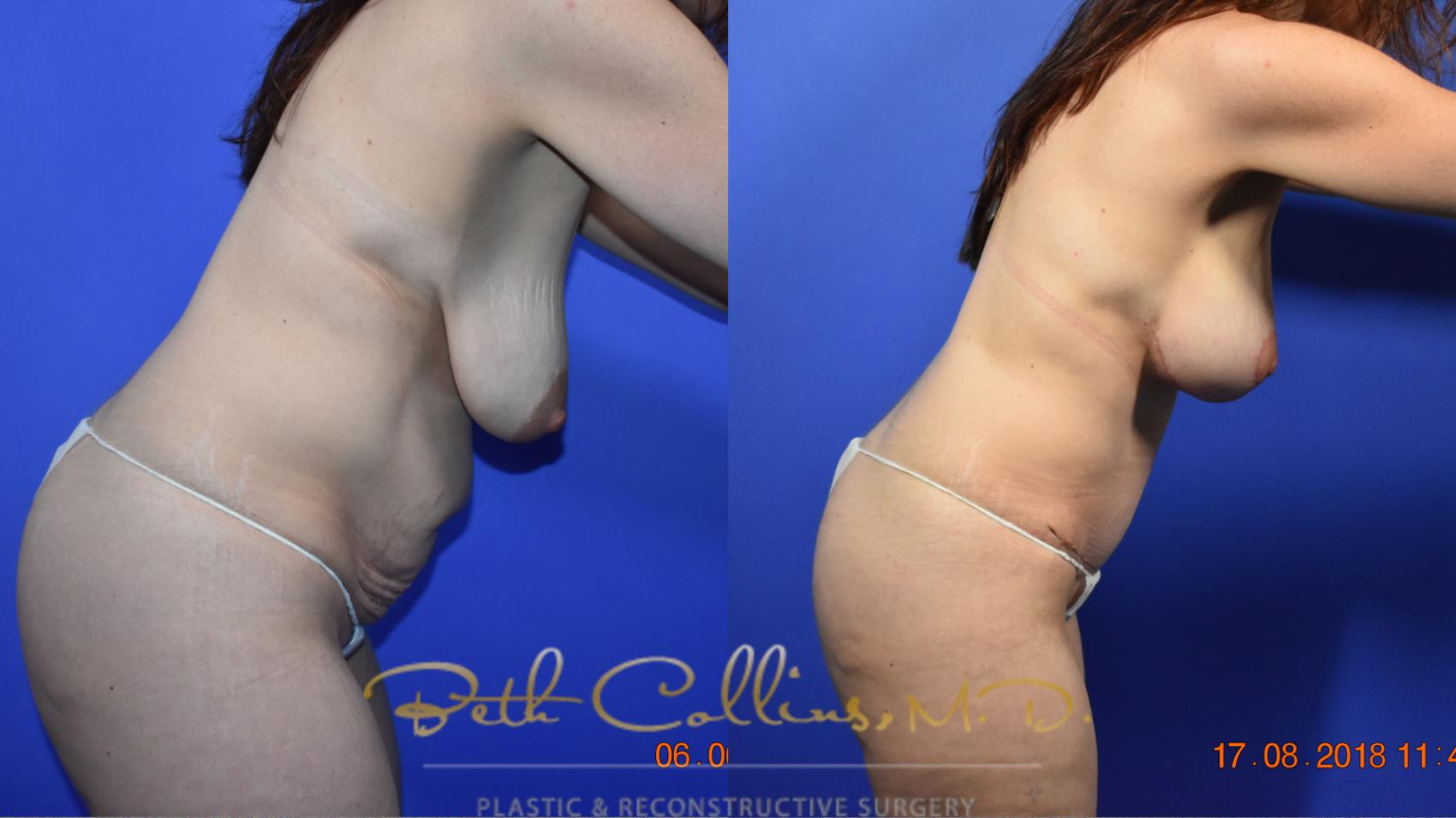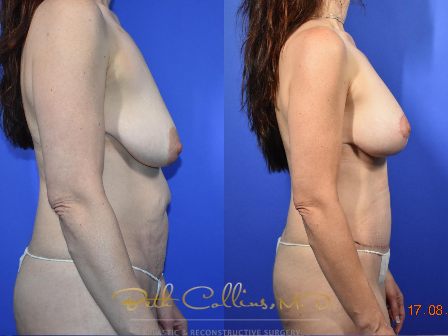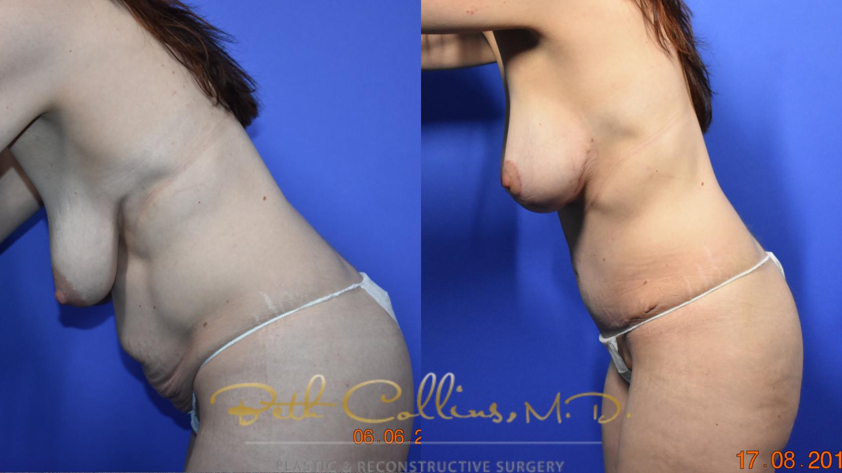 A mommy makeover can mean a number of different things involving correction of problems caused by pregnancy. Most often this involves surgery of the breast and abdomen, but can also involve other areas of the body. In this case, this patient complained of sagging breasts and excess fat and skin on her abdomen. To correct her issues, an augmentation mamma-platt with mastopexy were performed at the same time that the patient had a tummy tuck (abdominoplasty). In one surgery, all areas of complaint were fixed with one recovery.