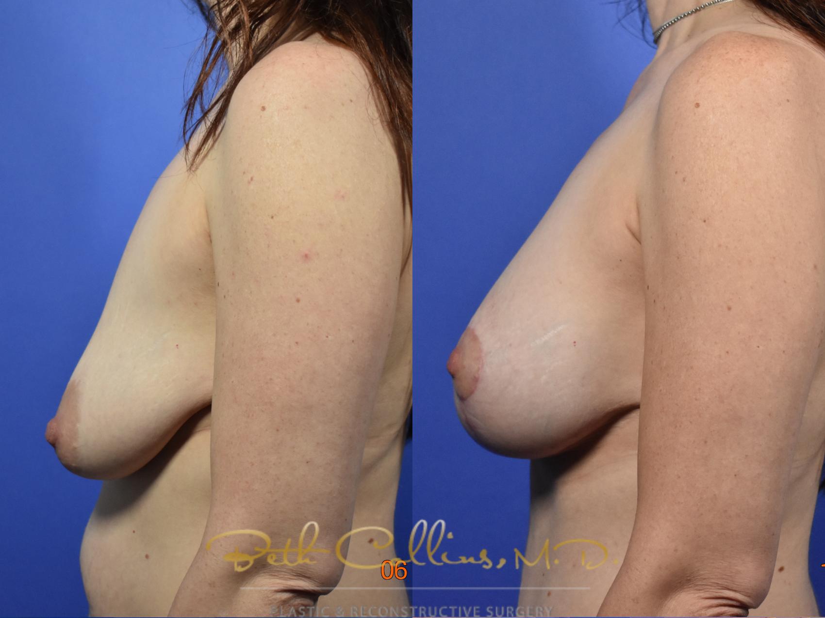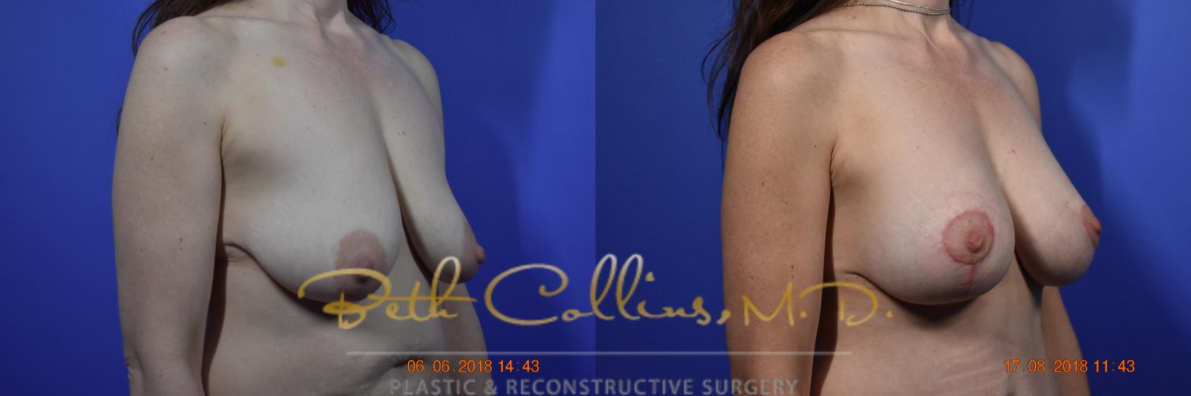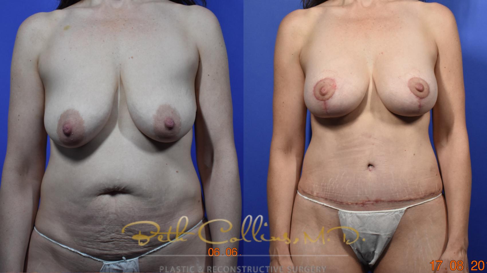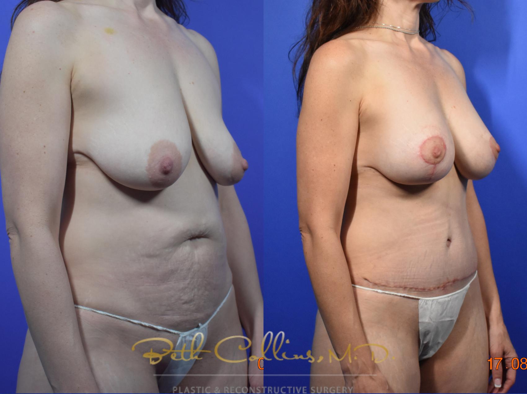 A mommy makeover can mean a number of different things involving correction of problems caused by pregnancy. Most often this involves surgery of the breast and abdomen, but can also involve other areas of the body. In this case, this patient complained of sagging breasts and excess fat and skin on her abdomen. To correct her issues, an augmentation mamma-platt with mastopexy were performed at the same time that the patient had a tummy tuck (abdominoplasty). In one surgery, all areas of complaint were fixed with one recovery.