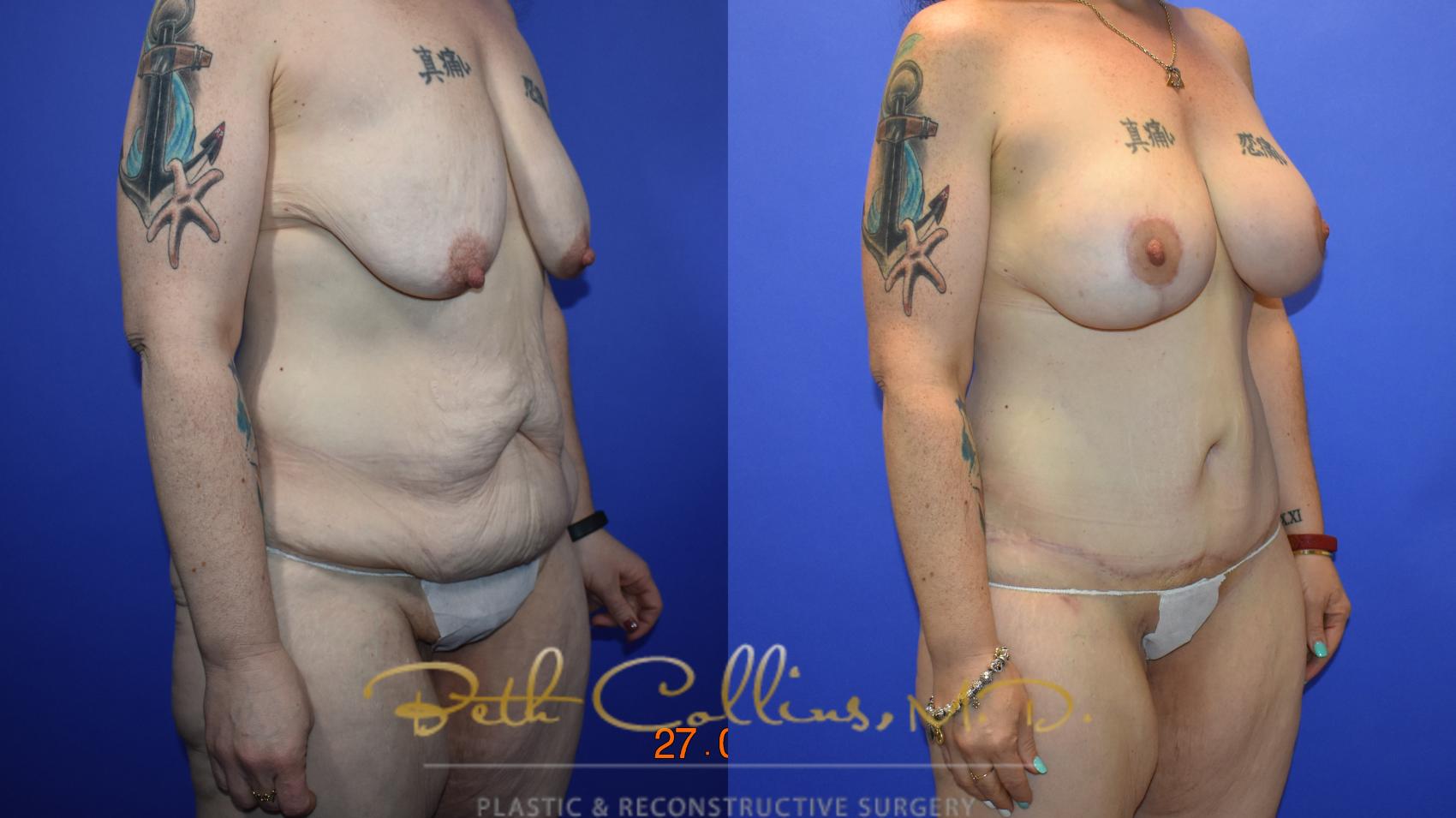 Often when people lose a significant amount of weight (usually more than 50-100 pounds), there is a significant amount of skin that tends to drape and sag because of the years that it had been stretched. Additionally, fat creates a higher level of estrogen which makes the connective tissue and skin stretch. These patients often seek body contouring surgery to trim the excess skin. The effects tend to be far reaching with skin laxity commonly removed from the abdomen, breasts, thighs, arms, buttocks and even face. This patient lost over 100 pounds with diet and exercise. Her sagging breasts and abdomen were bothersome to her, so we did a tummy tuck with a mastopexy/augment procedure. A 450 cc silicone gel implant was used.