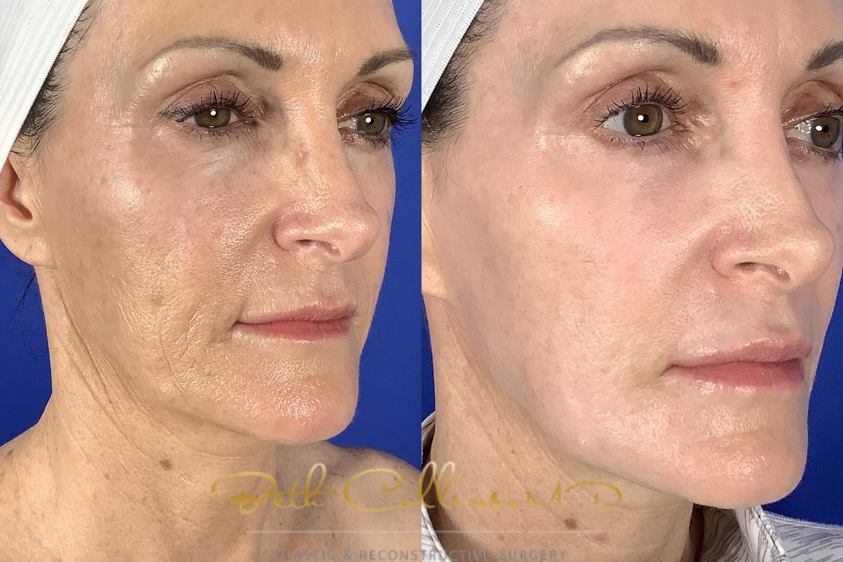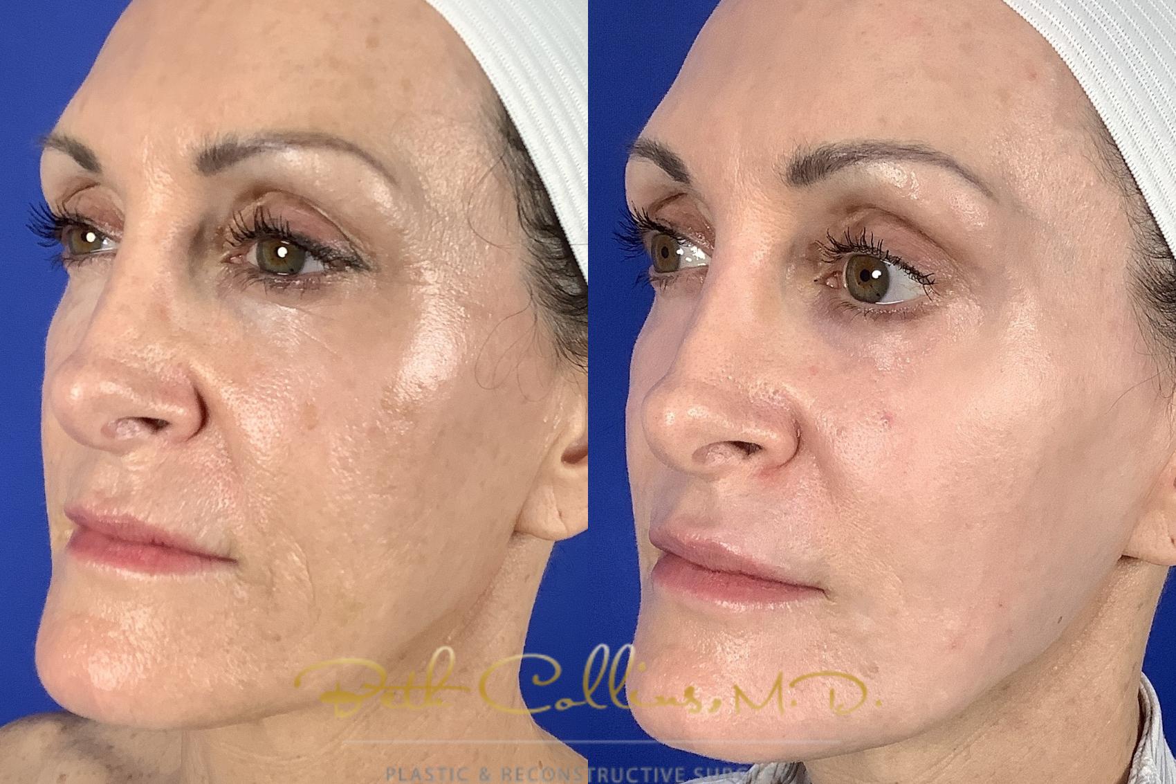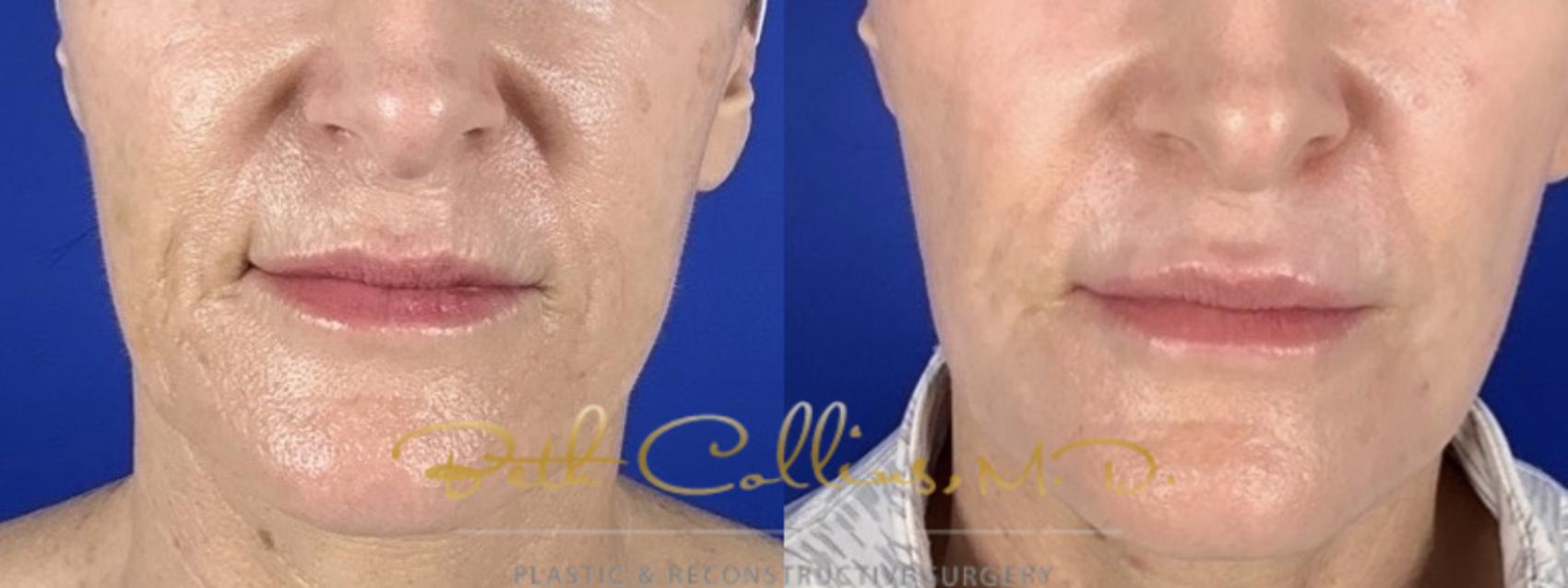 This patient was bothered by the sunspots on her face and the texture of the skin around her mouth. She wanted to have a treatment that would take care of these issues in one procedure so that she could just go into a maintenance program. We did a combination Photofacial and full field resurfacing laser where we were very aggressive around her mouth to smooth out the texture of her “smokers lines” and also reduce her pore size. You can see here that she has an overall improvement of the texture of her skin, the tone is even and her sunspots are erased. Now we have her in a quarterly maintenance program so that we keep her skin looking beautiful all year.