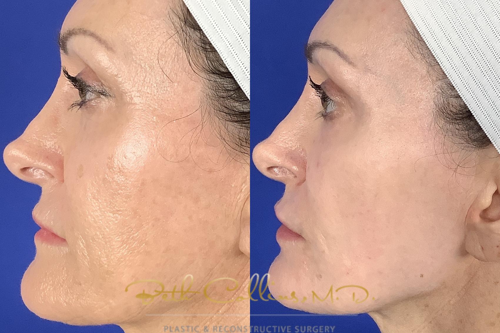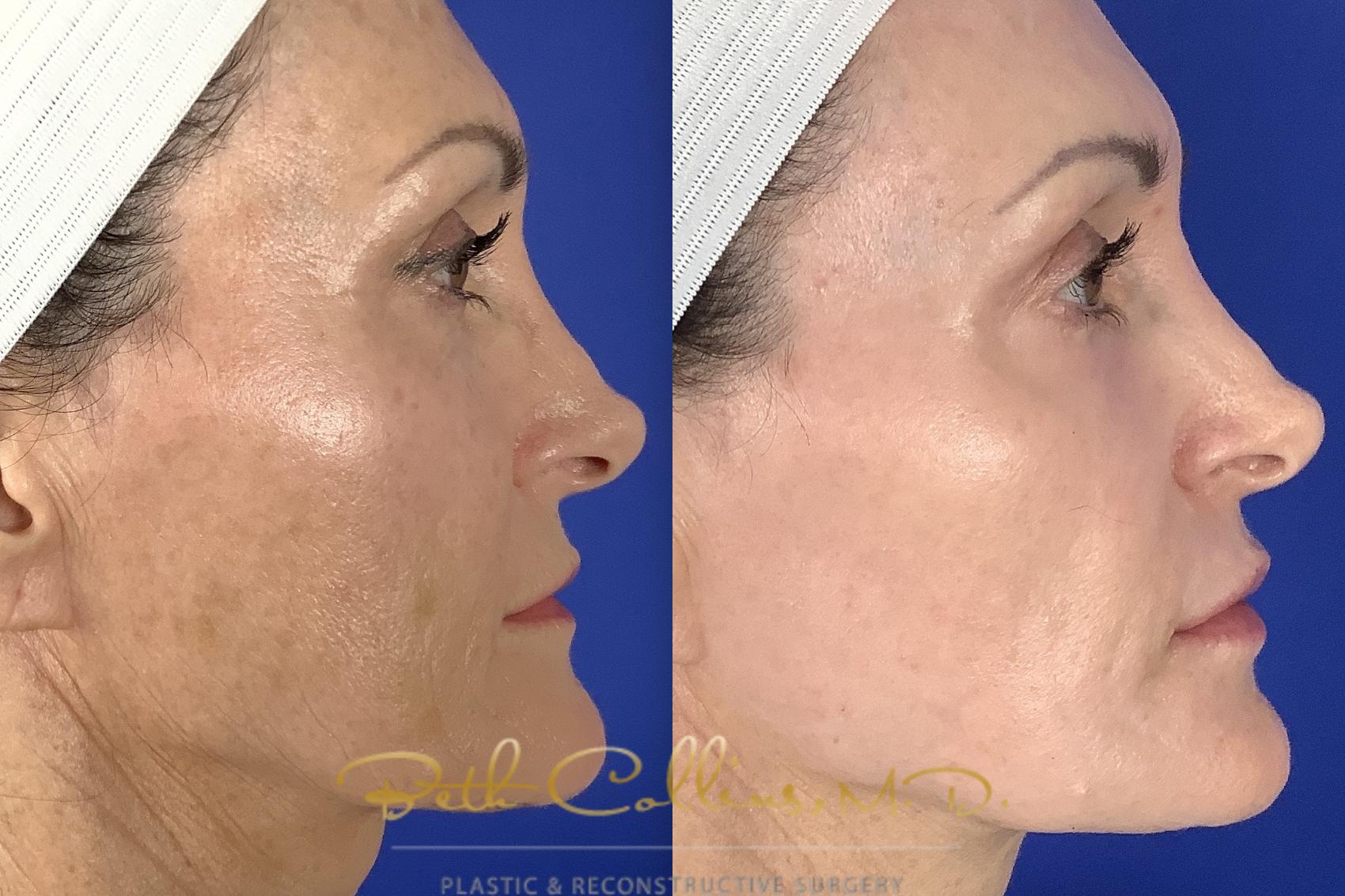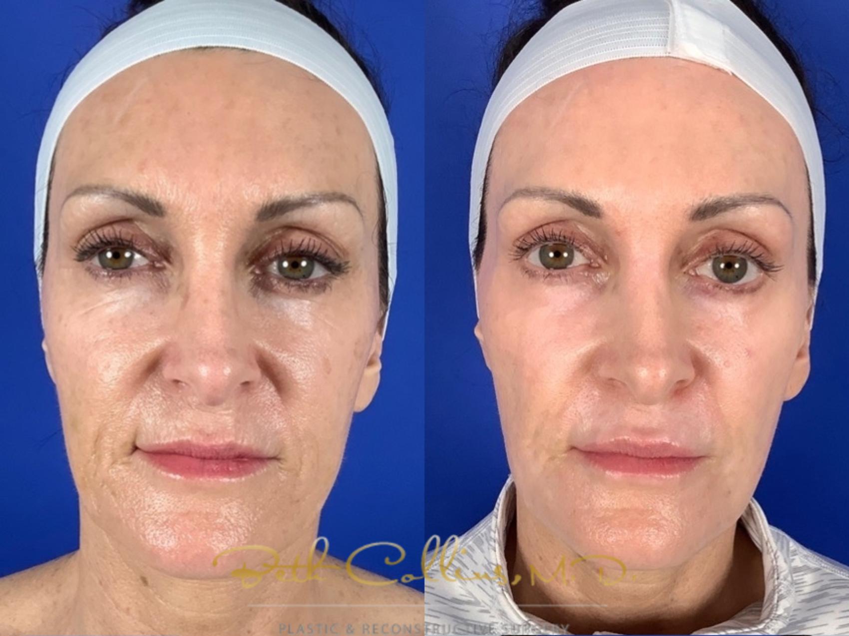 This patient was bothered by the sunspots on her face and the texture of the skin around her mouth. She wanted to have a treatment that would take care of these issues in one procedure so that she could just go into a maintenance program. We did a combination Photofacial and full field resurfacing laser where we were very aggressive around her mouth to smooth out the texture of her “smokers lines” and also reduce her pore size. You can see here that she has an overall improvement of the texture of her skin, the tone is even and her sunspots are erased. Now we have her in a quarterly maintenance program so that we keep her skin looking beautiful all year.